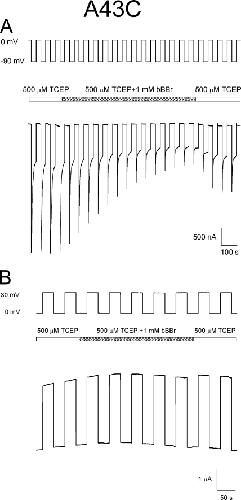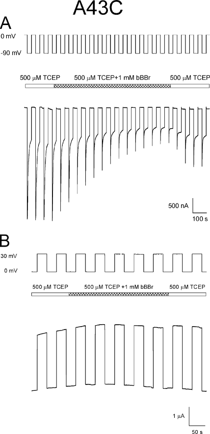 Figure 6. Modification of A43C residues by bBBr occurs at voltages that favor channel closure. (A) Macroscopic currents attributable to A43C channels are irreversibly decreased when exposed to bBBr during a voltage paradigm, steps between 0 and −90 mV, which elicits gating transitions between the open (0 mV) and either loop- and/or Vj-gating closed states (−90 mV). (B) Application of bBBr during a voltage paradigm, steps from 0 to 30 mV, which favors population of the open-channel state, has no effect on A43C macroscopic currents. The central bar in both panels indicates the time and duration for which the bath solution containing 500 µM TCEP was exchanged with the same bath solution containing 1 mM bBBr and subsequently washed with TCEP containing bath solution.