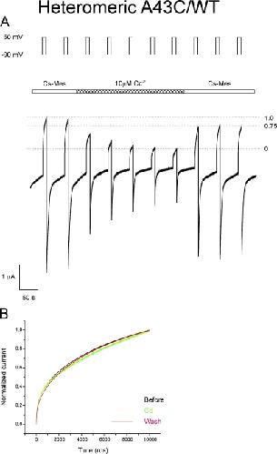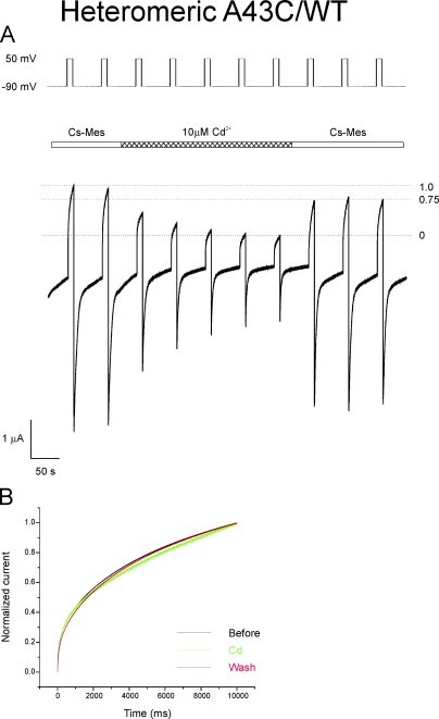 Figure 7. Effect of 10 µM CdCl2 on heteromeric channels formed by coexpressing 1:1 mixtures of WT and A43C RNA. (A) Heteromeric channels were treated with 20 µM DTT and washed with Cs-MES, 1.8 mM Ca2+ bath solution before the application of Cd2+ shown in the trace segment. After the reduction of macroscopic currents by treatment with 10 µM CdCl2, currents were restored to 75% of pre-cadmium levels by washing with cadmium-free bath solution. The result is interpreted to indicate that 25% of channels form a high affinity cadmium site that “locks” the channel in a closed conformation (see Results). (B) Comparison of the kinetics of channel activation upon depolarization to 50 mV before (black trace), during (green trace), and after (red trace) the application of Cd2+ in the trace shown in A. The two current traces before Cd2+ were averaged, as were the final two current traces after wash. The green trace is current trace obtained just before wash with Cd2+-free solution. The similarity among normalized traces indicates that the differences in current levels are not a consequence of differences in the kinetics of activation, but most likely reflects the proportion of channels that can be activated by the voltage step.