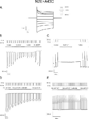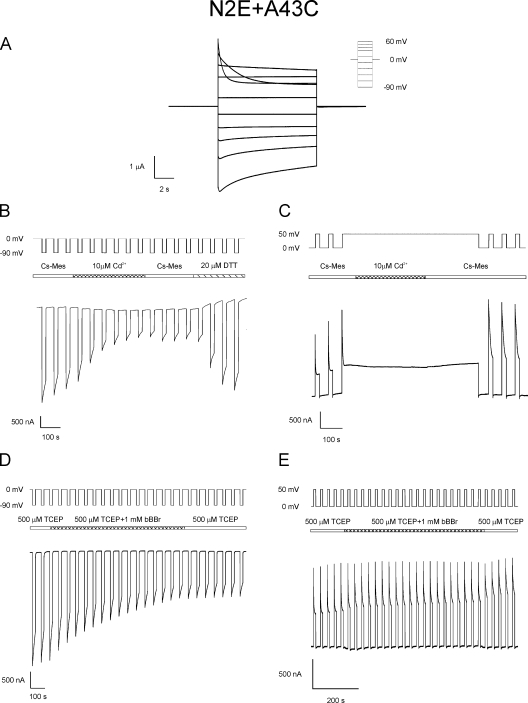 Figure 8. Unapposed N2E+A43C hemichannels are locked by cadmium and accessible to bBBr modification when the channel is closed by loop gating, but not Vj gating. (A) Macroscopic current traces obtained from N2E+A43C unapposed hemichannels after polarizations to voltages shown in the inset of 0 mV. Current relaxations at hyperpolarizing and depolarizing potentials result from the closure of loop and Vj gates, respectively. (B) Macroscopic currents were recorded from oocytes expressing the double mutation, N2E+A43C. The N2E mutation reverses the polarity of Vj gating from closure at hyperpolarizing potentials to closure at depolarizing potentials but does not change the polarity of loop gating. The application of 10 µM CdCl2 during a series of voltage steps between 0 and −90 mV causes a large decrease in membrane currents that can only be reversed by treatment with 20 µM DTT. Polarizations to −90 mV strongly favor the closure of loop gates, whereas residency in the open state is favored at a holding potential of 0 mV. (C) Macroscopic currents recorded from N2E+A43C oocyte using a similar protocol to that used in Fig. 5 B. 10 µM CdCl2 was applied to the channel after a long-duration depolarizing step to 50 mV that strongly favors closure of only the Vj gates. After wash with Cs-MES bath solution, the effect of cadmium on Vj gate closed channels was assessed by the application of a series of polarizing steps between 0 and 50 mV. This polarization elicits gating transitions between the open and Vj-gating closed states. Currents were similar to those obtained before cadmium application, demonstrating that A43C residues do not coordinate cadmium when the channel is closed by Vj gating. (D) Macroscopic current traces elicited by repeated polarizations between 0 and −90 mV, a voltage paradigm that elicits transitions between open and loop gate closed channels. At the position indicated, channels were exposed to 1 mM bBBr in the presence of 500 µM TCEP and subsequently washed with 500 µM TCEP. The observed reduction in current is consistent with a reaction between the A43C residue and bBBr. (E) Macroscopic current traces elicited by repeated polarizations between 0 and 50 mV, a voltage paradigm that results in the opening and closing of Vj gates. At the position indicated, channels were exposed to 1 mM bBBr in the presence of 500 µM TCEP and subsequently washed with 500 µM TCEP. The absence of any reduction in current is interpreted to indicate the inaccessibility of A43C residues to bBBr modification when the N2E+A43C channel resides in the open state and the Vj-gated closed state.