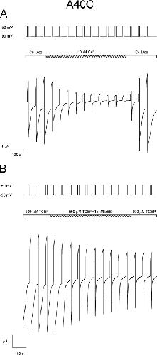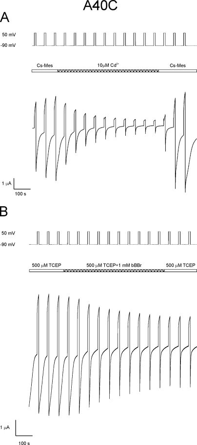Figure 9. Cadmium and bBBr reduce A40C currents. (A) Reduction of A40C unapposed hemichannel currents by CdCl2 is reversed by washing. Macroscopic currents attributable to A40C residues were examined by applying a series of voltage polarizations between −90 and 50 mV. The application of 10 µM CdCl2 during this voltage paradigm causes a ∼90% reduction in current in the case shown. However, unlike A43C channels, currents are fully restored by wash with cadmium-free bath solution. These results are interpreted to indicate that A40C residues do not form a high affinity cadmium binding site when the channel is closed by either loop or Vj gating. (B) A40C unapposed hemichannels are accessible to bBBr modification. BBBr was applied to the channels at the time indicated in the bar line as the channel was repeatedly stepped from −90 to 50 mV. Currents were reduced by ∼50% at positive potentials and were not reversed by wash.