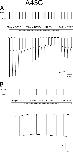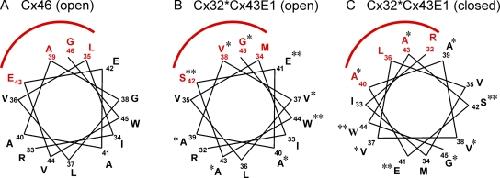 Figure 10. Helical wheel representation of reactive residues at the TM1/E1 border of Cx46 and Cx32*Cx43E1. (A) Helical wheel representation of residues R33 through G46 of Cx46. The residues span the TM1/E1 border, with residue E42 believed to be located on the membrane border. Residues accessible to MTS reagents applied to both the intercellular and extracellular face of the unapposed hemichannel are shown in red. These residues reside on one side of the helix, subtend an arc of ∼80°, and line the pore of the open Cx46 unapposed hemichannel. Residue R33 is topmost in the figure, with the residue number increasing counterclockwise. Data are taken from Kronengold et al. (2003). (B) Helical wheel representation of homologous residues R32 through G45 of Cx32*Cx43E1 that line the pore of the open unapposed Cx32*Cx43E1 channel. Residues examined in this study are marked with asterisks. Two residues, V38C and G45C, react with MTSEA–biotin-X when the reagent is applied from either the intracellular or extracellular face of the channel and consequently are assigned as pore lining. Expression levels of S42C and E41C were insufficient to allow studies of accessibility to thiol modifying reagents, whereas W44C did not express membrane current. These residues are marked by two asterisks. (C) Helical wheel representation of the loop gate closed Cx32*Cx43E1 channel. The helical wheel pictured in B was rotated 140° clockwise to position residues A40C and A43C. This position accounts for the observed sensitivity of residues A40C and A43C to Cd2+ and their modification by bBBr when the channel is closed by loop gating (see Discussion).