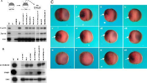 Figure 7. CDK9:cyclin complexes modulate the endoderm-inducing activity of Mix.3. RT-PCR analysis for endodermal markers was performed on RNA prepared from animal pole explants dissected from injected embryos. A: Analysis of early endoderm marker gene expression in animal pole explants. Ectopic expression of Mix.3 induces expression of the early endoderm genes Sox17 beta and Darmin. Co-injection of CDK9:cyclin T2 blocks Mix.3's endoderm inducing activity. Deletion of the CDK9-interaction domain from Mix.3 (Mix.3 Delta 123) eliminates the ability of cyclin T2 to repress Mix.3-mediated endoderm gene expression. The deletion mutant (Mix.3 Delta 123), when injected alone, induced endoderm markers. The inhibition of Mix.3-directed endoderm induction in animal pole explants requires the kinase activity of CDK9. Co-injection of a kinase-dead mutant of CDK9 (CDK9dead) with cyclin T2 did not block Mix.3 endoderm induction indicating that this is not an inhibitory effect of cyclin T2 alone. Cyclin K co-injected with CDK9 did not interfere with Mix.3 endoderm-inducing activity. B: RT-PCR analysis of late markers of endoderm differentiation. Animal pole explants were assayed at stage 36 for the late endodermal markers endodermin and intestinal fatty acid binding protein (IFABP). As demonstrated at earlier stages, CDK9:cyclin T2, but not CDK9:cyclin K, can block Mix.3-directed induction of endodermal markers. The inhibition of Mix.3 endoderm by CDK9:cyclin T2 is dependent on the kinase activity of CDK9. C: The effect of Mix.3, CDK9, and cyclin T2 or K co-injection on endogenous darmin expression was measured by in situ hybridization. Embryos were injected in one blastomere at the two-cell stage with test mRNA together with a beta -galactosidase ( beta -gal) mRNA as a lineage tracer (stained red). In situ hybridization analyses for darmin expression (stained blue/purple) were performed at stage 18. The injected side (stained red) is on the left; endogenous darmin expression is seen on the untreated (right) side of the embryo. Representative embryos for each group are shown; the number of embryos examined and the percentage that are the same as the representative are noted below. (i) beta -gal alone (n = 61). (ii) Mix.3 induces ectopic darmin expression (white arrow) in the whole embryo (100% of embryos have ectopic darmin expression, n = 51). (iii) Mix.3 Delta 123. Deletion of the CDK9 interaction domain has no effect on the ability of Mix.3 to induce ectopic darmin expression (93% displayed ectopic darmin expression, n = 25/27). (iv) Mix.3 + CDK9 induces ectopic darmin expression similar to Mix.3 mRNA alone (98%, n = 45/46). (v) Mix.3 + cyclin T2. Cyclin T2, in the absence of added CDK9, does not block the ability of Mix.3 to induce ectopic darmin expression (100%, n = 27). (vi) Mix.3 + cyclin K. Mix.3 induces ectopic darmin expression in the presence of added cyclin K (100%, n = 20). (vii-viii) Mix.3 + CDK9 + cyclin K. Mix.3 induces ectopic darmin expression in the presence of added CDK9 and cyclin K (96%, n = 47/49). (ix-x) Mix.3 + CDK9 + cyclinT2. Co-injection of cyclin T2 mRNA with Mix.3 + CDK9 blocks ectopic darmin expression (86% showed inhibition of ectopic darmin expression, n = 49/57). (xi-xii) Mix.3 Delta 123 + CDK9 + cyclin T2. The ability of CDK9 + cyclin T2 to block Mix.3-directed ectopic darmin expression is dependent on the CDK9 interaction domain in the C-terminus of Mix.3 (94%, n = 29/31). |