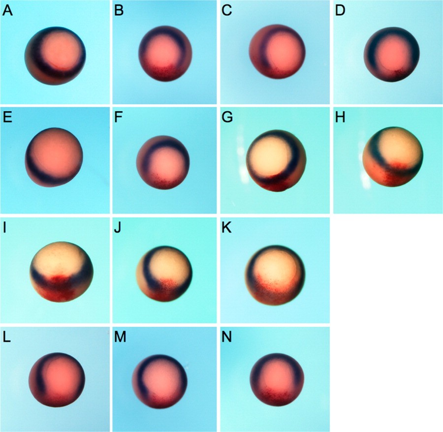 Figure 6. Endogenous Xenopus brachyury is down-regulated by ectopic expression of Mix.3. Embryos were injected in one blastomere at the two-cell stage with test mRNA together with a beta -galactosidase ( beta -gal) mRNA as a lineage tracer (stained red). In situ hybridization analyses for Xbra expression (stained blue/purple) were performed at early gastrula (Stage 10.5). Representative embryos for each group are shown; the number of embryos examined and the percentage that are the same as the representative are noted below. A: beta -gal alone (100%, n = 61). B,C: Mix.3. Ectopic expression of Mix.3 results in decreased Xbra expression on the injected side of the embryo (96% have decreased Xbra expression, n = 107/112). D: Mix.3 Delta 123. A mutant of Mix.3 that cannot interact with CDK9 maintains Xbra repression activity (100%, n = 21). E: CDK9. Expression of CDK9 alone does not disrupt Xbra expression in the marginal zone of the embryo (100%, n = 23). F: Mix.3 + CDK9. CDK9 expression does not block the repression of Xbra expression by Mix.3 (100%, n = 25). G: Cyclin K (100%, n = 22). H: Cyclin T2 (100%, n = 23). I: CDK9 + cyclin K (100%, n = 51). J,K: CDK9 + cyclin T2. Expression of CDK9 with cyclin T2 disrupts Xbra expression (89%, n = 40/45). L: Mix.3 + CDK9 + cyclin K (100%, n = 25). M: Mix.3 + CDK9 + cyclin T2 (100%, n = 44). N: Mix.3 Delta 123 + CDK9 + cyclin T2 (98%, n = 46/47). |