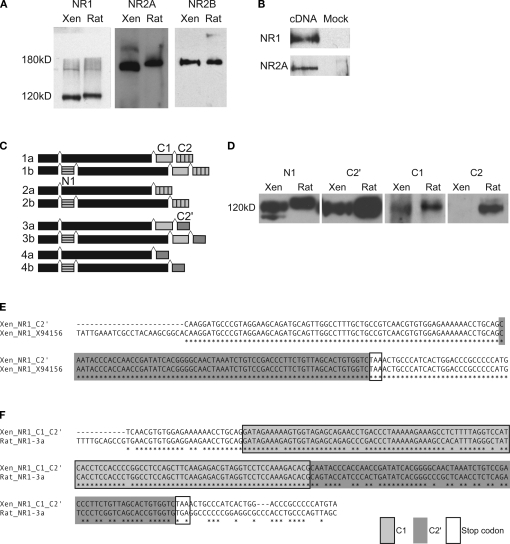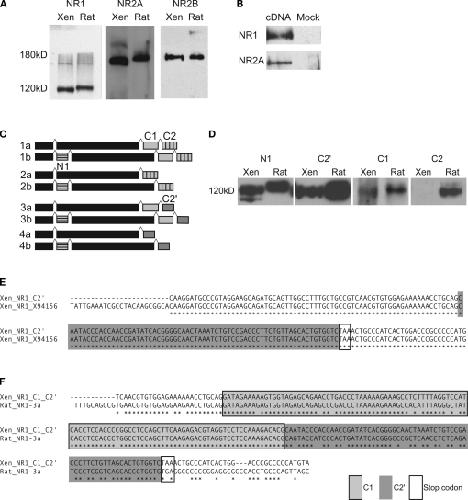 Figure 1. Detection of NMDAR subunits and splice variants in X. laevis tadpole brain. (A) Immunoblots for NR1, NR2A and NR2B were done on whole brain lysates of stage 47/48 tadpoles (Xen) with antibodies generated against homologous rat proteins. Immunoreactive bands of about the same size as in rat whole brain lysate (Rat) were found for all three subunits. (B) Western blots of whole cell lysates of HEK293 cells transfected with X. laevis the NR1-4a/b splice variant or NR2A cDNA, and their mock-transfected controls. (C) Cartoon of NR1 splice variants and the alternatively spliced exons (N1, C1, C2) and C-terminal ends (C2â²) that they contain. (D) Cross-reactive bands for exons N1 and C1, as well as alternative C-terminal end C2â² in X. laevis were detected with antibodies to rat homologs by Western blot on whole brain extracts from stage 47/48 tadpoles and rat. No cross-reactive band was detected for C2. (E,F) C-terminal ends of NR1 mRNAs were amplified by RT-PCR and PCR with primer pairs 5â² to the spliced region and in the 3â²UTR. (E) Twenty-six out of 29 nucleotide sequences contained only C2â² (Xen_NR1_C2â²). They aligned perfectly to the published X. laevis NR1 sequence (Xen_NR1_X94156). (F) Two out of 29 nucleotide sequences contained C1 and C2â² (Xen_NR1_C1_C2â²), indicating that NR1-3a/b also exists in X. laevis. The alignment to rat NR1-3a (Rat_NR1-3a) shows a very high degree of sequence conservation. Identical residues are marked with (*). |