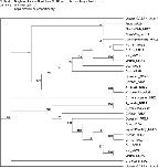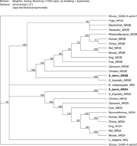 Figure 2. Phylogenetic trees of NR2A and NR2B. The phylogenetic relationships of 11 NR2A and 14 NR2B proteins from different species and the NR2 proteins from C. elegans and D. melanogaster were analyzed using the Neighbor Joining algorithm. The confidence values of the nodes were determined after bootstrapping with 1000 repetitions and are shown at the nodes. The trees were rooted by aligning two unrelated sequences, mouse GABA-A-a1 and GABA-A-a2 (gray italics). The cloned X. Laevis NR2A and NR2B are bold, sequences that were assembled by hand are in italics and the remaining sequences have GenBank accession numbers. |