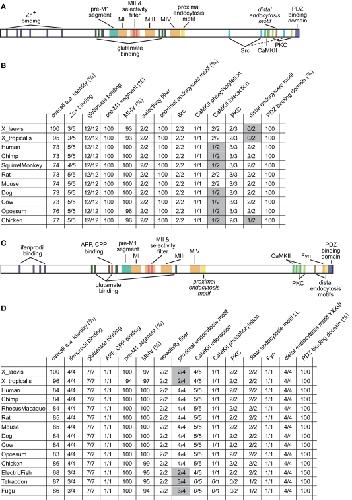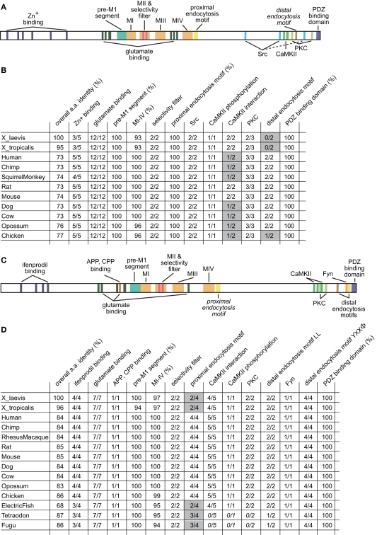 Figure 3. Conserved residues in X. laevis NR2A and NR2B. (A) Cartoon of the annotated functional domains and residues of NR2A. (B) Table of the number and percentage of conserved residues and domains of NR2A from 11 different species. The overall amino acid identity was determined in comparison to the X. laevis NR2A protein. (C) Cartoon of the annotated functional domains and residues of NR2B. (D) Table of the number and percentage of conserved residues and domains of NR2B from 14 different species. The overall amino acid identity was determined in comparison to the X. laevis NR2B protein. The number or percentage of conserved residues was determined in comparison to the sequence of the species where they were first characterized (mostly rat). Functional sites that are not conserved between all species are highlighted in gray. |