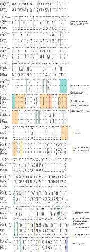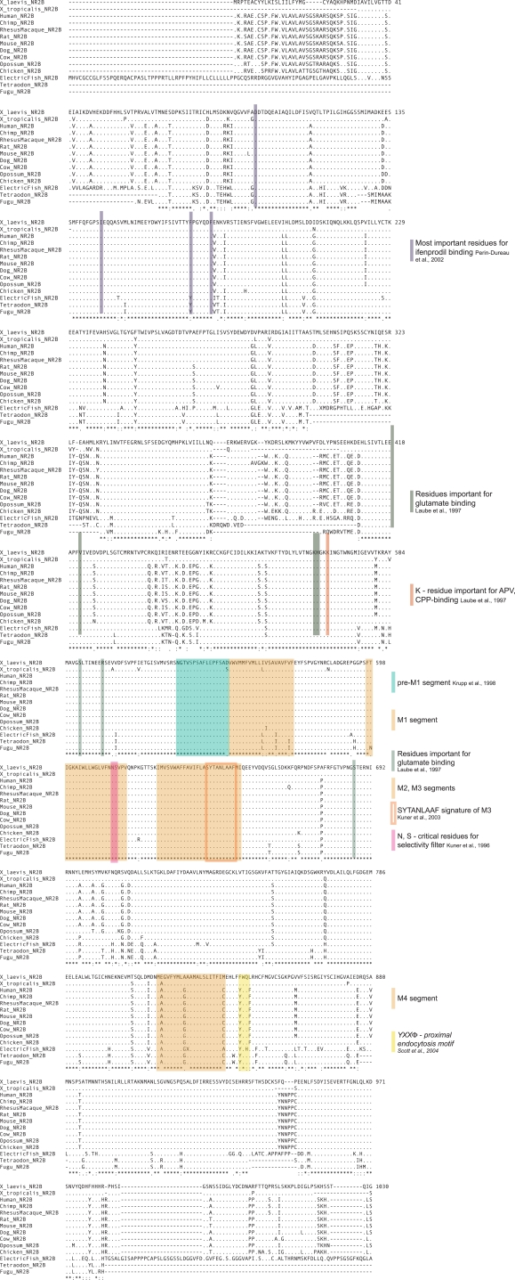 Figure 5. Protein sequence alignment of NR2B from 14 different species. The protein sequences of X. laevis NR2B and 13 other species were aligned with the ClustalW algorithm. When full sequences were not available or could not be assembled by hand, incomplete sequences were used. Amino acids identical to the reference sequence are depicted as (.). Lack of sequence is symbolized by (−). A (*) below the alignment signifies amino acid identity, while (:) and (.) indicate the degree of amino acid similarity. NR2B is very highly conserved between species. The membrane-associated segments M1–M4, other structurally and functionally important domains and amino acids, as well as known protein–protein interaction domains and phosphorylation sites are highlighted. Descriptions in italics indicate sites that are not conserved between species. |