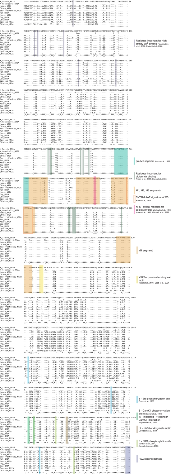 Figure 4. Protein sequence alignment of NR2A from 11 different species. The protein sequences of X. laevis NR2A and 10 other species were aligned with the ClustalW algorithm. When full sequences were not available or could not be assembled by hand, incomplete sequences were used. Amino acids identical to the reference sequence are depicted as (.). Lack of sequence is symbolized by (−). A (*) below the alignment signifies amino acid identity, while (:) and (.) indicate the degree of amino acid similarity. NR2A is highly conserved between species. The membrane-associated segments M1–M4, other structurally and functionally important domains and amino acids, as well as known protein–protein interaction domains and phosphorylation sites are highlighted. Descriptions in italics indicate sites that are not conserved between species. |