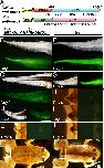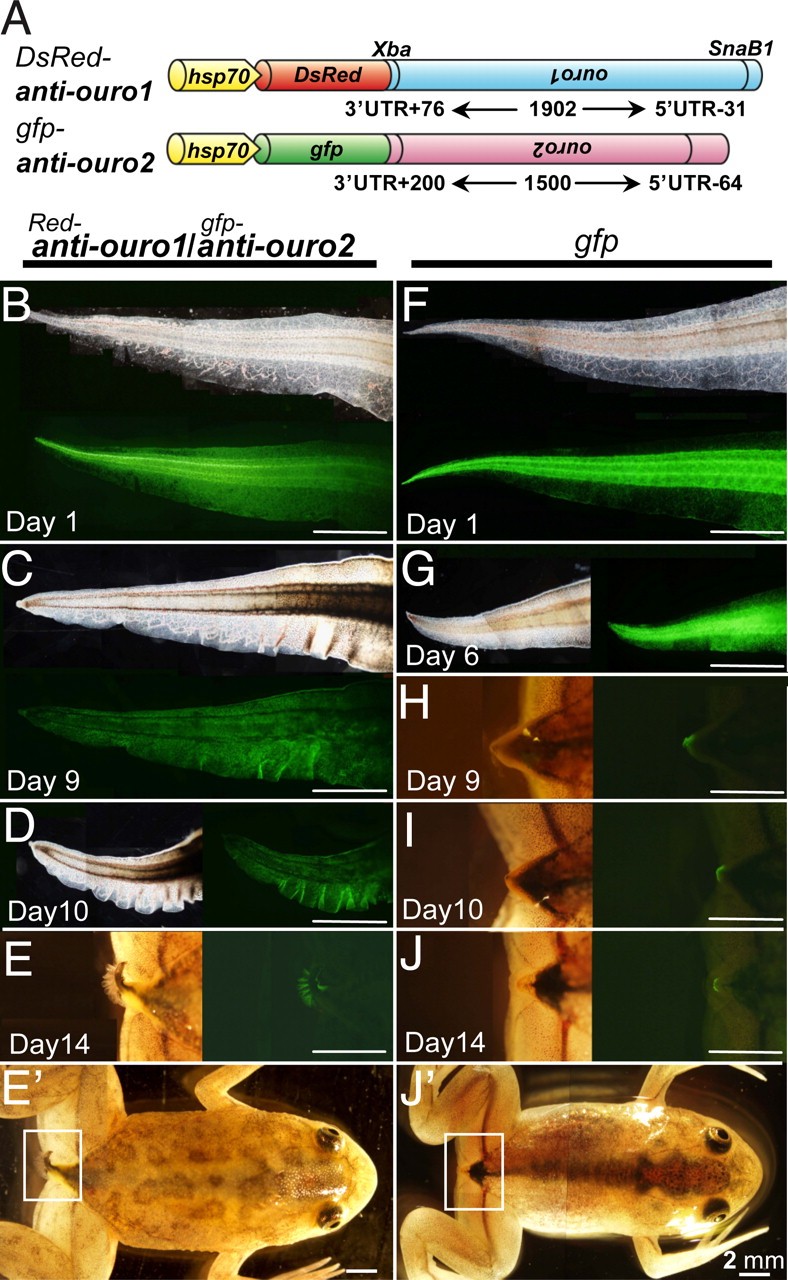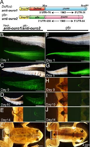Fig. 4. Knockdown of ouro1 and ouro2 gene expression results in retention of tailskin. (A) Antisense constructs for ouro1 and ouro2. Reverse-oriented ouro1 or ouro2 cDNA were placed after DsRed or gfp, respectively, which were driven by the hsp70 promoter. (BâE and Eâ²) Suppression of tail regression in DsRed-anti-ouro1/gfp-anti-ouro2 DT tadpoles. Tails of DsRed-anti-ouro1/gfp-anti-ouro2 DT tadpoles (F0) on days 1â14 after HS at stage 58/59 are shown by bright field and fluorescence microscopy (only GFP is shown). Note: DsRed-anti-ouro1/gfp-anti-ouro2 DT animals exhibit a pronounced delay in tail regression with a folded epidermis. (FâJ and Jâ²) gfp transgenic control. HS-induced gfp transgenic tadpole (line 9, F2) show normal tail degeneration. Boxed areas in Eâ² and Jâ² are magnified for E and J, respectively.