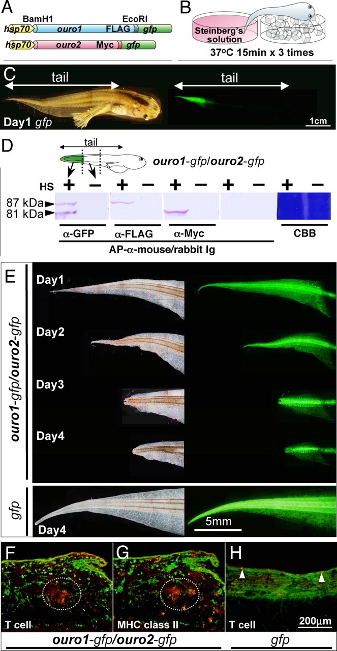 Fig. 3. Precocious tail degeneration by overexpression of ouro1 and ouro2 genes. (A) DNA constructs used to generate transgenic animals. Ouro proteins were fused to the FLAG- or Myc-tag and the GFP protein. The expression constructs are under the control of the HS promoter hsp70. (B) HS treatment. The distal part of the tadpoletail was heat-treated by immersion in Steinberg's solution at 37 °C. (C) Induction of GFP expression by HS. GFP was only detected in a HS-treated region of the tail. The panel shows a typical case, which is the gfp F2 transgenic line (see Fig. S6, line 9) tadpole on day 1 after HS treatment. (D) Western blot analysis of induced Ouro fusion proteins. ouro1-gfp/ouro2-gfp DT F2 tadpoles (see Fig. S6, line 2) were used. Expression of both introduced genes was detected in the HS-treated area (+), but not in nontreated area (â) on day 1 after HS. Arrowheads indicate the Ouro fusion proteins. Blotted proteins were stained with Coomassie Brilliant Blue (CBB). A representative blot from two independent experiments is shown. (E) Induction of precocious tail regeneration by HS. Tails of ouro1-gfp/ouro2-gfp DT (line 2) on days 1â4 after HS at stage 58/59 showed precocious degeneration (Upper). HS-induced gfp-transgenic tadpoles (line 9) showed a normal tail (Lower). Bright field (Left) and GFP fluorescence image (Right) are paired. (FâH) Accumulation of T cells in the HS-treated tails. Vertical frozen sections of HS-treated tails of ouro1-gfp/ouro2-gfp DT tadpole (line 1) (n = 8) (F and G) and gfp transgenic tadpole (line 8) (n = 8) (H) F1 tadpoles on day 3 after HS were stained with anti-GFP antibody (green) (FâH) and anti-Xenopus T cells (red) (F and H) or with anti-Xenopus MHC class II antibody (red) (G). Dotted circles in serial sections (F and G) indicate an assembly of T cells (F) expressing MHC class II (G). Arrowheads, a few T cells seen in the tailepidermis of the gfp control (H).