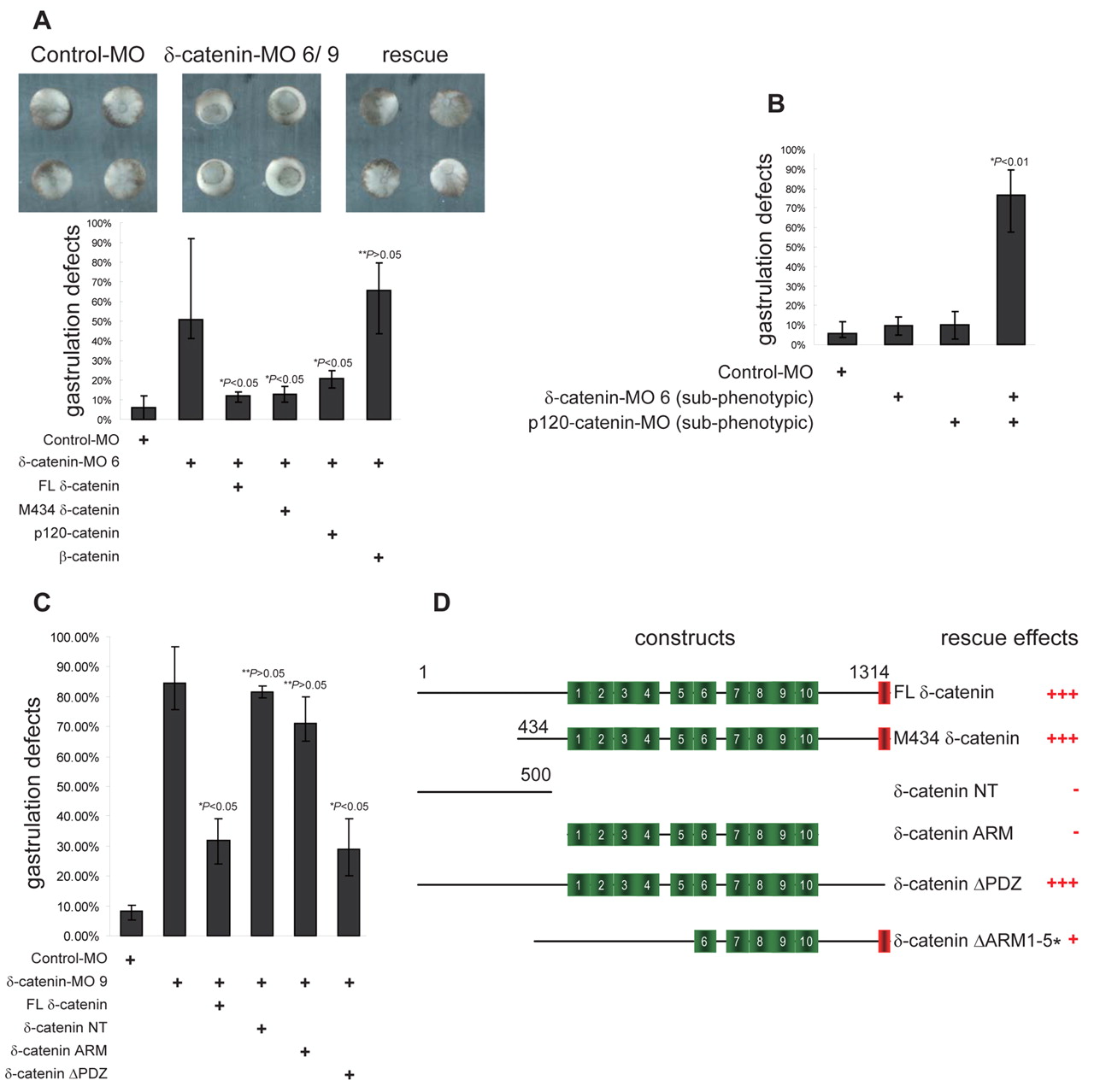 Figure 6. Fig. 6. δ-catenin-knockdown phenotypes are rescued by overexpression of either δ-catenin or p120-catenin. (A) The specificity of δ-catenin-depletion phenotypes were verified through rescue with select constructs. Exogenous and titrated FL (full-length) δ-catenin (see also supplementary material Fig. 4A,B) as well as M434 δ-catenin (initiated with the fourth potential translation start site, see also Fig. 1) largely rescued blastopore closure defects arising from endogenous δ-catenin depletion. Titrated levels of p120-catenin, but not β-catenin, also reproducibly displayed significant rescuing activity. (B) Co-injection of δ-catenin and p120-catenin morpholino, each at subphenotypic doses, produces enhanced phenotypic effects.(C) Use of a depletion-rescue strategy suggests that the PDZ-binding motif of δ-catenin is dispensable for the rescuing capacity of δ-catenin in blastopore closure. By contrast, the δ-catenin N-terminus or armadillo domain in isolation failed to rescue δ-catenin depletion. (D) Schematic presentation of various rescue constructs with a summary of their rescuing effects (asterisk indicates data from Fig. 7D). For all panels P-values indicate statistical significances. |