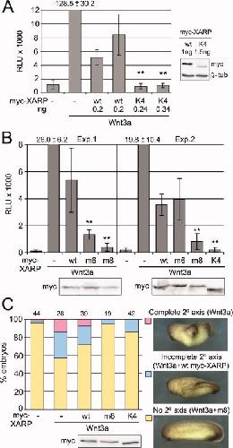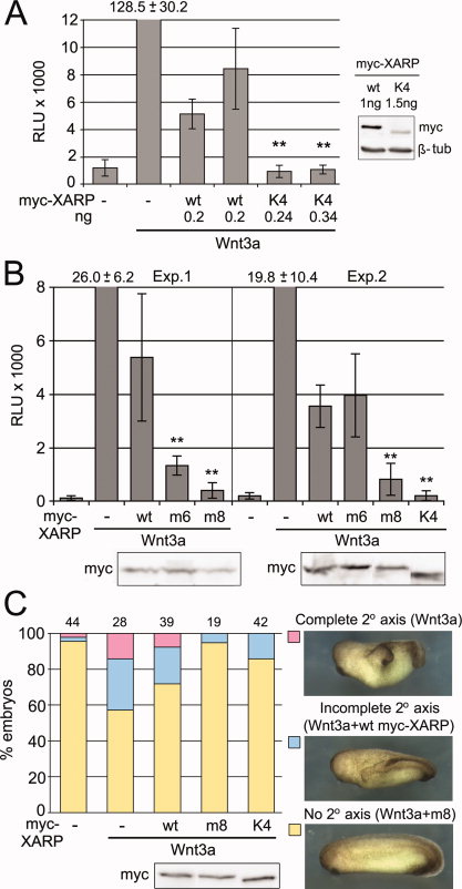 Figure 3. XARP constructs with disrupted centrosomal localization have an increased activity as Wnt pathway antagonists. A: SuperTOPFlash reporter assay using 0.2 ng and about 0.3 ng of RNAs encoding wild-type XARP and K4, respectively, which is proportional (5 times less) to the doses used for Western blot analysis. B: SuperTOPFlash reporter assay using myc-wild-type XARP, m6, m8, or K4. Two representative experiments are shown. **P with wild-type <0.01. C: Secondary axis induction assay. Xenopus embryos were injected with RNAs encoding Wnt3a alone or together with indicated myc-XARP constructs and, at stage 27, classified as either without secondary axis (2°) or with incomplete or complete secondary axis, based on the absence or presence of the cement gland, respectively. Embryos representing each phenotype, along with injected constructs in parentheses, are shown on the right. Numbers above graph bars represent the number of analyzed embryos.