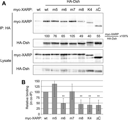 Figure 4. XARP constructs with disrupted centrosomal localization have decreased Dsh binding. A: A representative co-immunoprecipitation experiment showing total (“Lysate”) and co-precipitated (“IP”) Dsh and XARP proteins. Intensity of XARP and Dsh bands in “IP” lanes was measured using ImageJ software. Ratios of XARP/Dsh band intensities are presented relative to wild-type XARP binding (100%). B: Average ± S.D. from five independent experiments. **P with wild-type <0.01. ΔC, XARPΔC construct.