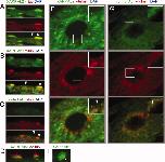 Figure 5. Localization of endogenous XARP in the centrosome and basal bodies. A,D,F: XARP Ab2 detects basal bodies of ciliated cells and apically localized centrosomes in the epidermis. B: XARP Ab1 detects basal bodies in the epidermis. C: Control rabbit antibody (anti-myc) does not detect either basal bodies or centrosomes in the epidermis. E,G: XARP Ab2, but not a control rabbit antibody (anti-GST), detects centrosomes in the retina. Insets show magnified images of the boxed areas. All images are cross-sections of stage 26 Xenopus embryos (except F, a surface view of a ciliated cell) co-stained with rabbit polyclonal XARP Ab1 or Ab2 (green), mouse gamma -tubulin antibody (red) or mouse acetylated tubulin antibody (cilia marker, red), and DAPI (chromatin marker, blue). A-C,E,G: Bottom panels are merged images of the top two panels. Arrowheads mark centrosomes, asterisks mark basal bodies.