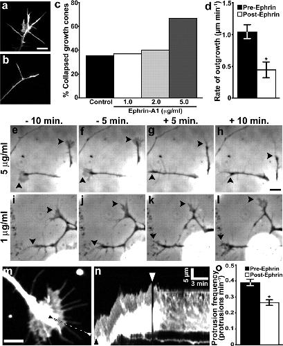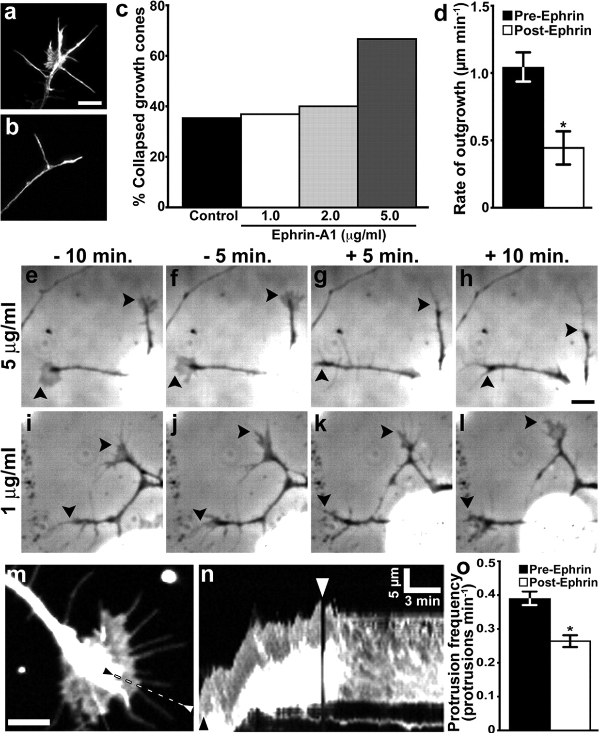 Figure 1. Low-dose ephrin-A1 reduces growth cone motility without inducing collapse. a, b, RGC growth cones cultured from total retina treated for 10 min with control medium (a) or 5 μg mlâ1 ephrin-A1 (b). Growth cones were stained with fluorescent phalloidin to label F-actin. c, Percentage of collapsed growth cones after a 10 min treatment with 1 (n = 40), 2 (n = 38), or 5 (n = 36) μg mlâ1 ephrin-A1 or control medium (n = 82). d, Average rate of neurite outgrowth before and after the addition of 1 μg mlâ1 ephrin-A1 (n = 21). eâl, RGC growth cones (arrowheads) at the indicated times before and after treatment with 5 (eâh) or 1 (iâl) μg mlâ1 ephrin-A1. Growth cones collapse and axons retract in response to 5 μg mlâ1 but not 1 μg mlâ1 ephrin-A1. m, n, RGC growth cones expressing GFP were imaged for 10 min before and after the addition of 1 μg mlâ1 ephrin-A1. The kymograph in n was generated along the dashed line between arrowheads shown in m. Note that after ephrin addition (white arrowhead), the leading edge ceases to advance forward and there are few membrane protrusions. The black arrowhead indicates time point of the still image in m. o, Ephrin-A1 (1 μg mlâ1) significantly reduces the frequency of leading-edge membrane protrusion. *p < 0.05, n = 28. Scale bars: aâl, 10 μm; m, 5 μm; calibration as indicated in n. |
