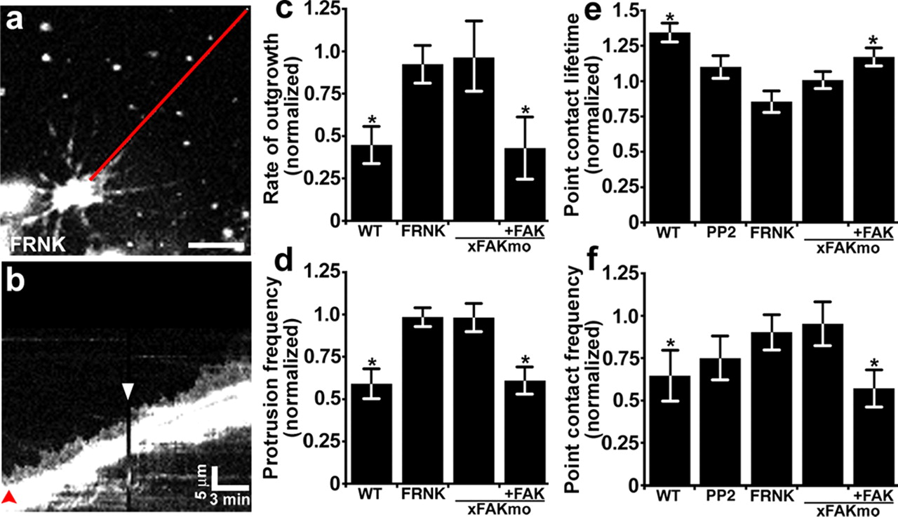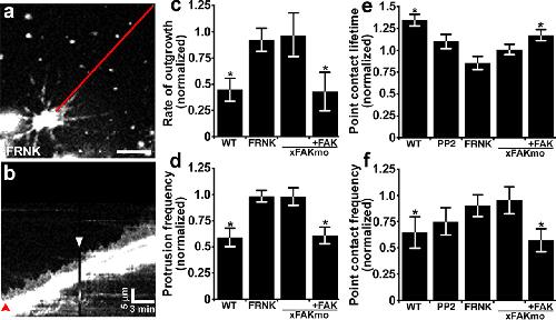 Figure 4. FAK and Src are required for ephrin-A1-induced changes in growth cone motility and point contact dynamics. a, A growth cone expressing GFP-FRNK was imaged at 10 s intervals for 10 min before and after the addition of 1 μg mlâ1 ephrin-A1. b, Kymograph assembled along the red line indicated in a. In this GFP-FRNK-expressing growth cone, no apparent changes in leading-edge protrusion occur upon ephrin addition (white arrowhead). The red arrowhead indicates time point of the still image in a. c, d, Average rates of neurite outgrowth and protrusion frequency normalized to the pretreatment period measured 10 min before ephrin-A1 addition. Therefore, each bar represents the change in rate or protrusion after ephrin-A1 addition. Control data were duplicated from Figure 1. n ⥠11 growth cones for each condition. e, f, Analysis of point contact dynamics of growth cones expressing paxillinâGFP together with myc-FRNK or FAKmo (±chick GFP-FAK) normalized to each pretreatment lifetime and frequency measured 10 min before ephrin-A1 addition. There is no significant change in the average point contact lifetime (e) or frequency (f) after addition of ephrin-A1 in either FRNK or FAKmo growth cones. Control data were duplicated from Figure 2. Inhibition of Src by pretreatment with 2 μM PP2 or inhibition of FAK with FRNK or FAKmo prevents inhibitor effects of ephrin-A1. *p < 0.05 (paired Student's t test used in c, d, f). WT, Wild type. Scale bars, 5 μm or as indicated. |