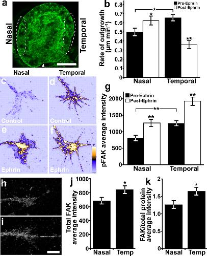 Figure 5. Nasal and temporal retinal neurons exhibit opposite responses to ephrin and differential FAK expression levels. a, Projected confocal z-series through a whole-mount stage 29 Xenopus eye labeled with A488-phalloidin. Extreme nasal or temporal 1/8 to 1/10 of eye primordia (dashed regions) were isolated and cultured on LN for 18â24 h. Arrowhead indicates the ventral fissure. b, The average rates of neurite outgrowth by nasal and temporal axons over 15 min periods before and after the addition of 1 μg mlâ1 ephrin-A1. Ephrin-A1 promotes nasal axon outgrowth, while the same treatment significantly decreased the rate of temporal axon outgrowth. n ⥠54 neurons from four cultures for each condition. câf, Representative RGC growth cones labeled for pY-397 FAK and pseudocolored based on fluorescence intensity (warmer colors indicate greater intensity). Growth cones from nasal and temporal RGC axons were treated for 5 min with control medium (c, d) or 2 μg mlâ1 ephrin-A1 (e, f) before immunolabeling. Note that even without ephrin-A1 treatment, temporal growth cones (d) appear to have more pY-397 FAK labeling than nasal growth cones (c), while both increase pY-397 FAK after ephrin treatment. g, The average fluorescence intensities of pY-397 FAK immunolabeling measured within growth cones. Before ephrin stimulation, temporal growth cones have significantly higher baseline pY-397 FAK levels than nasal growth cones, but ephrin-A1 significantly increases pY-397 FAK in both nasal and temporal growth cones over control. n ⥠69 growth cones for each condition. h, i, Representative RGC growth cones isolated from nasal (h) and temporal (i) retina and labeled for total FAK. j, The average fluorescence intensities of total FAK immunolabeling measured within growth cones from nasal and temporal retina. k, The average fluorescence intensities of total FAK immunolabeling normalized to total protein shows that significantly more FAK is expressed in temporal compared with nasal RGC growth cones. *p < 0.05. **p < 0.001 (paired Student's t test in b). Scale bars: a, 100 μm; câf, h, i, 5 μm. |