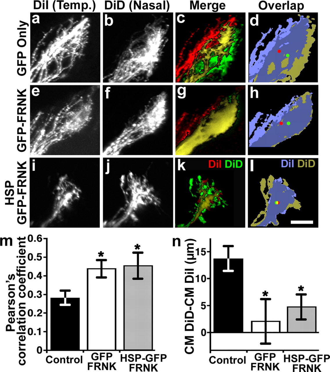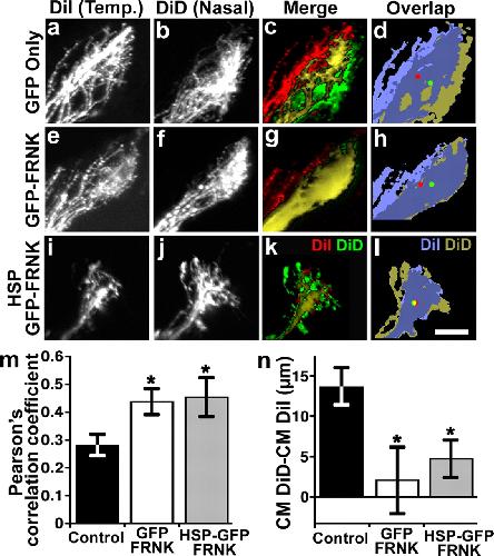 Figure 7. Inhibition of FAK activity disrupts anterior–posterior mapping of retinal axons in the optic tectum. a–l, Projected confocal z-stacks of lateral views of the optic tectum. Anterior is to the left. RGC axons from the contralateral eye express either GFP (a–d), GFP-FRNK (e–h), or hsp:GFP-FRNK (i–l). In each embryo, temporal (Temp.) RGC axons were labeled with DiI (a, e, i) and nasal axons were labeled with DiD (b, f, j). Merged images of projected z-stacks show labeled temporal (red), nasal (green), and merged (yellow) axon arbors (c, g, k). Merged images of thresholded projections of labeled temporal (light blue) and nasal (gold) axon arbors were used to determine each arbor CM indicated by red (temporal) and green (nasal) dots (d, h, l). In control GFP-expressing embryos, nasal axons terminate posterior to temporal axons and exhibit only partial overlap (c, d). However, in embryos expressing GFP-FRNK or hsp:GFP-FRNK, nasal and temporal axons overlap extensively. m, The Pearson's correlation coefficient was used to assess the degree of colocalization between nasal and temporal axons. n, The difference between the DiI and DiD CM distances is significantly smaller in GFP-FRNK and hsp:GFP-FRNK embryos, suggesting that nasal and temporal axons are no longer topographically segregated. n ≥ 8 embryos for each condition. *p < 0.05. Scale bar, 30 μm. |
