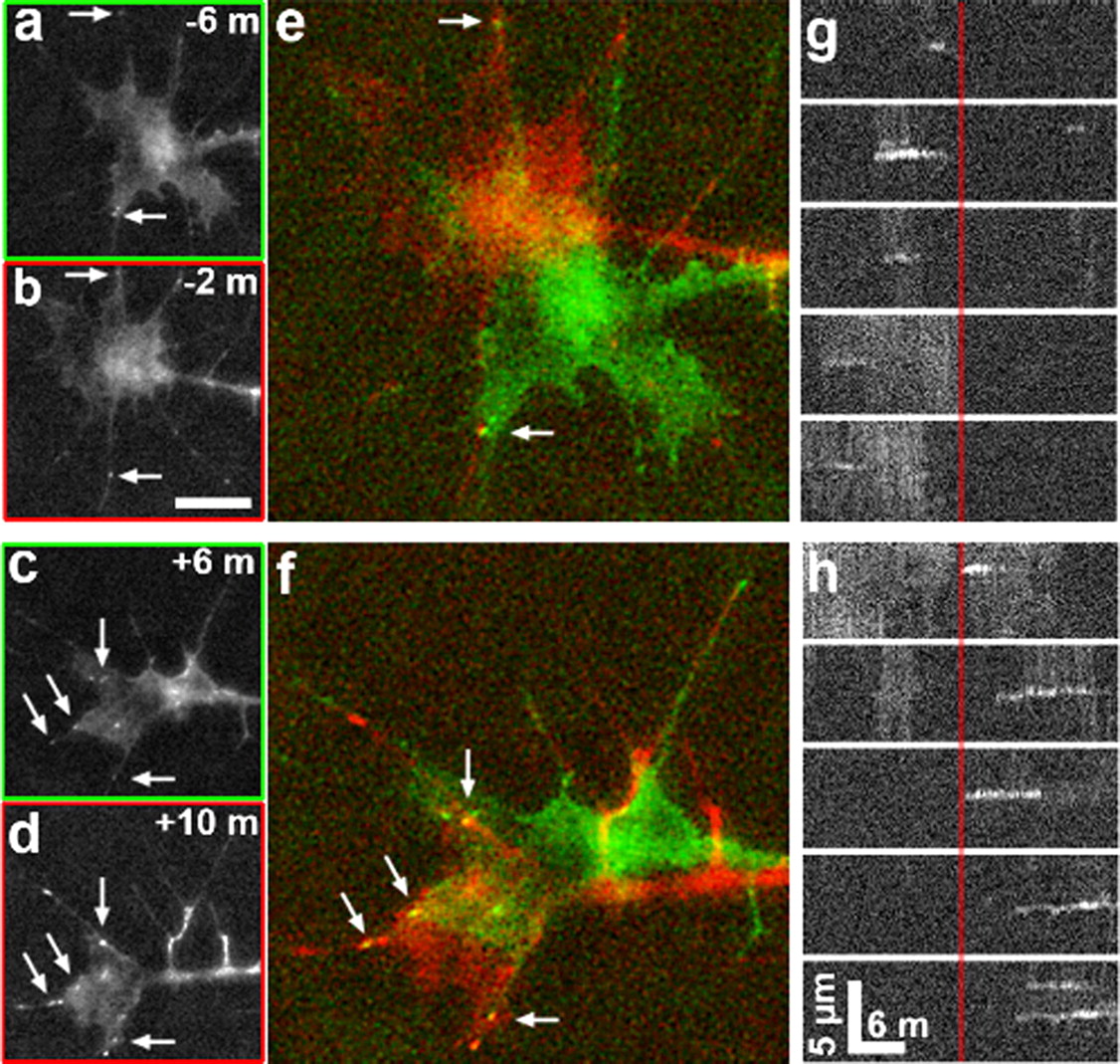 Figure 2. Ephrin-A1 stabilizes growth cone point contacts. a–d, Time-lapse images of RGC growth cones expressing paxillin–GFP at 4 min intervals before (a, b) and after (c, d) the addition of 1 μg ml−1 ephrin-A1. e, f, Two-color merged images generated from time points indicated (a–d). Note that a greater number of stable point contacts are observed over the 4 min period after ephrin addition (arrows). g, h, Kymographs generated through the five most prominent point contacts that formed before (g) compared with after (h) ephrin-A1 addition. The vertical red line indicates the time point when 1 μg ml−1 ephrin-A1 was added. Note that the point contacts that form after ephrin-A1 addition (right of red line) are longer lived than those that form before ephrin addition. Scale bars: a–d, 10 μm; e, f, 5 μm; calibration as indicated in g, h. |