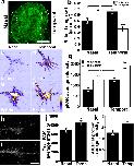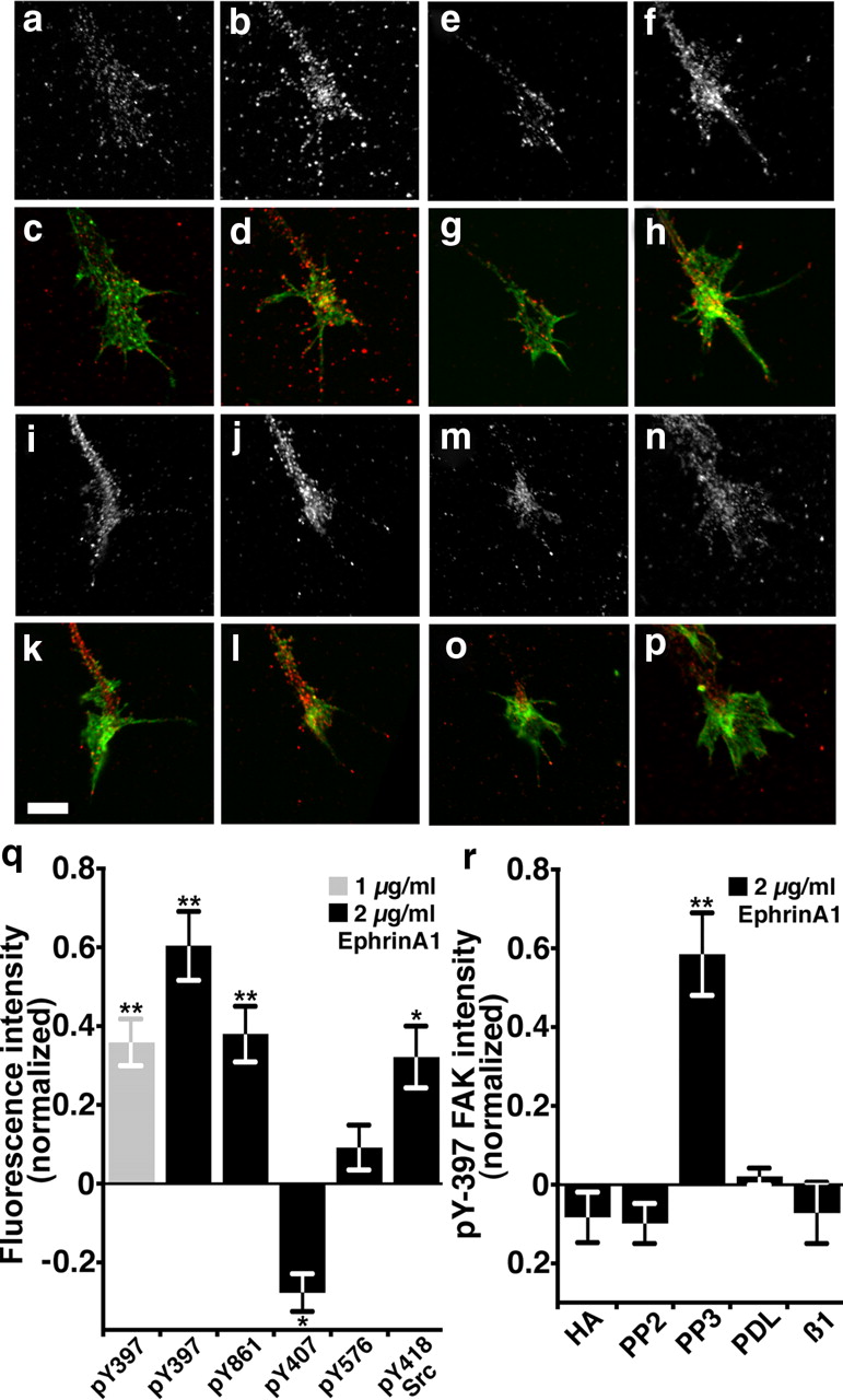 Figure 3. Ephrin-A1 activates FAK and Src signaling. a–d, Representative growth cones labeled with an antibody that recognizes pY-397 FAK (a, b) together with fluorescent phalloidin to label F-actin (c, d). Growth cones treated with 2 μg ml−1 ephrin-A1 for 5 min (b, d) appear to have higher pY-397 FAK staining compared with mock-treated control growth cones (a, c). e–h, Representative control growth cones labeled with an antibody that recognizes pY-861 FAK (e, f) together with fluorescent phalloidin to label F-actin (g, h). Growth cones treated with 2 μg ml−1 ephrin-A1 for 5 min (f, h) appear to have higher pY-861 FAK staining compared with untreated growth cones (e, g). i–l, Representative growth cones labeled with an antibody that recognizes pY-418 Src (i, j) together with fluorescent phalloidin to label F-actin (k, l). Growth cones treated for 5 min with 2 μg ml−1 ephrin-A1 (j, l) appear to have higher pY-418 Src staining compared with mock-treated control growth cones (i, k). m–p, Representative growth cones cultured on PDL labeled with an antibody that recognizes pY-397 FAK (m, n) together with fluorescent phalloidin to label F-actin (o, p). Growth cones treated for 5 min with 2 μg ml−1 ephrin-A1 on PDL (n, p) appear to have no difference pY-397 FAK staining compared with mock-treated control growth cones (m, o). q, Quantification of pY-FAK and pY-Src labeling in growth cones. The average fluorescence intensity of PY labeling within growth cones was normalized against growth cones treated with control media for each experimental condition. n ≥34 growth cones from two to four cultures for each condition. r, Ephrin-induced changes in pY-397 FAK were blocked by pretreating growth cones for 5–10 min with the general tyrosine kinase inhibitor HA (2 μM), or with a Src family kinase-specific inhibitor (PP2, 2 μM), or by culturing neurons on a non-integrin-binding substratum (PDL), or by pretreating neurons on LN with a β1-integrin function-blocking antibody (β1, 100 μg/ml). n ≥ 35 growth cones from two to four cultures for each condition. *p < 0.05. **p < 0.001. Scale bar, 5 μm. |