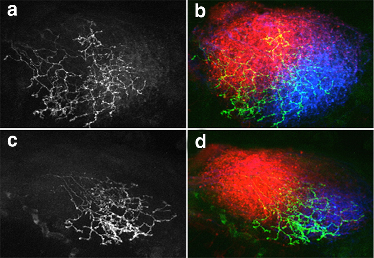 Figure 8. Inhibition of FAK activity disrupts anterior–posterior mapping of retinal axons in the zebrafish optic tectum. a–d, Projected confocal z-stacks of dorsal views of the optic tectum of a zebrafish embryo at 5 days postfertilization. Anterior is to the upper left. RGC axons from the contralateral eye express either GFP (a, b) or GFP-FRNK (c, d) under control of the pou4f3 promoter. Merged images of projected z-stacks show temporal RGC axons labeled with DiI (red), nasal axons labeled with DiD (blue), and GFP-expressing (green) axon arbors. Control GFP-expressing RGCs arborize widely across the tectum (a, b), while GFP-FRNK-expressing RGCs arborize more posteriorly (c, d). Scale bar, 30 μm. |