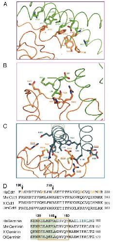 Fig. 2. The tripartite human htCdt1:htGeminin interface. The primary (A), secondary (B), and tertiary (C) interfaces are shown (coloring and bounding boxes as in Fig. 1). Interacting residues are shown as a stick model; carbon atoms follow the cartoon coloring; oxygens, nitrogens, and sulfurs are in red, blue, and green. Important residues are labeled; mutation sites in Cdt1 that are used in this study have labels underlined (the residues deleted in hvtGem are grayed out). (D) A multiple-sequence alignment of the sequence regions involved in the formation of the novel tertiary interface; residues in orange for Cdt1 and dark green for Geminin are the ones depicted also in (C). Arrowheads denote the mutation sites on the Cdt1 tertiary interface, the vertical bar and the green shading box indicate the Geminin deletion construct, and the dark yellow bounding box the region substituted in the grafting mutations (residues 139–150).