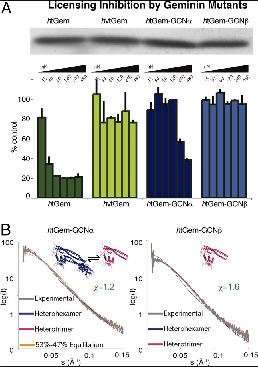 Fig. 4. Correlation between Geminin mutants activity and quaternary arrangement of the Cdt1:Geminin complex. (A) htGem, hvtGem, htGem-GCN4α, and htGem-GCN4β were tested for their ability to inhibit DNA replication in Xenopus egg extracts. For each construct, 6 concentrations were tested: 480, 240, 120, 60, 30, and 15 nM; a Coomassie blue-stained gel was used for loading control and is shown. For the graph, 100% replication was adjusted based on buffer-treated extracts, and error bars represent standard errors of the mean. (B) The experimental SAXS profile of htCdt1:htGem-GCN4α (Left) and htCdt1:htGem-GCN4β (Right) are compared with the theoretical scattering curves calculated from the heterohexamer and heterotrimer. Only the low-angle regions are shown for clarity; the coloring scheme is as in Fig. 3 A and D.
