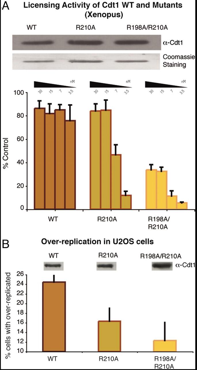 Fig. 5. Functional significance of tertiary interface Cdt1 mutants. (A) WT human Cdt1 fragment 158–546 and 2 mutants (R210A and R198A/R210A) were tested for their ability to rescue DNA replication in Cdt1-depleted Xenopus egg extracts. For each construct, four concentrations were tested: 30, 15, 7, and 3.5 nM. One hundred percent represents replication in non–immune-depleted extracts. Error bars represent standard errors of the mean. Equal loading of Cdt1 constructs was verified by Coomassie staining and Western blot analysis with anti-His antibody. (B) Rereplication in U2OS cells with reduced cyclin A activity is different when wtCdt1 or the 2 interface mutants (R210A, R198A/R210) are overexpressed. The panel reports the mean and the standard error of the mean of 4 independent experiments; the baseline 10%, representing the mean amount of cells with rereplicated DNA in cells with reduced cyclin A.