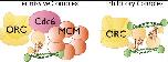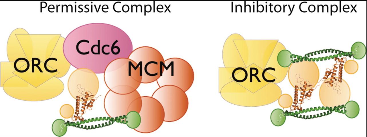 Cdt1 molecules in orange, Geminin molecules in green and blue shades. The