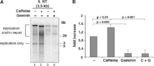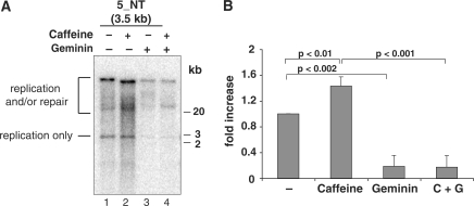 Figure 3. Replication of linear substrates. (A) BsmBI linearized 3.5 kb NT pRST5_NT (5_NT) was incubated with egg cytosol at 1.5 ng/µl in the presence of either buffer control, 5 mM Caffeine, 100 ng/µl Geminin or Caffeine and Geminin for 30 min before addition of 2-fold volumes of NPE and (α-32P)dCTP. Reactions were processed after 60 min for native agarose gel electrophoresis. The radioactive signal of three independent experiments were quantified by Phosphorimager (B). Values for untreated conditions are set to 1. P-values were calculated using a t-test.
