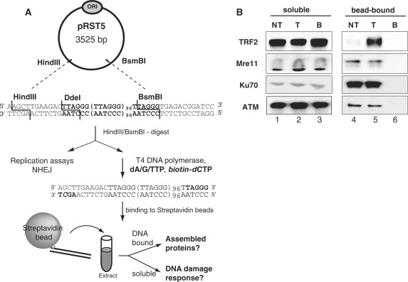 Figure 1. Generation and characterization of telomeric DNA substrates. (A) pRST5 contains an insert of 98 telomeric repeats (bold), which is excised by BsmBI/HindIII to generate 0.6 kb linear substrates containing exclusively telomeric DNA. Overhangs are filled by T4 DNA polymerase, dA/G/TTP and biotinylated dCTP. After incubation of immobilized substrates for 20 min in cytosolic extracts, proteins in the soluble fraction or bound to DNA are monitored by western blotting. Non-biotinylated DNA is used for replication and NHEJ assays. A NT control plasmid pRST5_NT harbors a random sequence of similar length. (B) Bead-bound NT or telomeric (T) DNA was incubated with cytosolic extracts at 2 × 109 ends/µl. Soluble fractions were separated (lanes 1–3), beads washed and bead-bound fractions (lanes 4–6) analyzed by western blotting. Lanes 3 and 6, beads only.