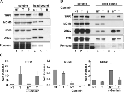 Figure 2. Assembly of pre-RC components on telomeric DNA. (A) Assembly of pre-RC proteins on immobilized 0.6 kb telomeric or NT DNA in cytosolic extracts as described in Figure 1B. A part of the membrane stained with Ponceau was used as an internal loading control. (B) Immobilized 0.6 kb NT or telomeric substrates were incubated with egg cytosol at 30 ng/µl for 30 min before addition of 2-fold volumes of NPE. Reactions were processed after 25 min as in Figure 1B. 100 ng/µl Geminin was added to the egg cytosol in lanes 7 and 8. (C) Quantification of the signals for TRF2, ORC2 and MCM6 from (B) for three independent experiments. Signals were normalized to the signal of the Ponceau stain. Values for untreated NT conditions are set to 1.