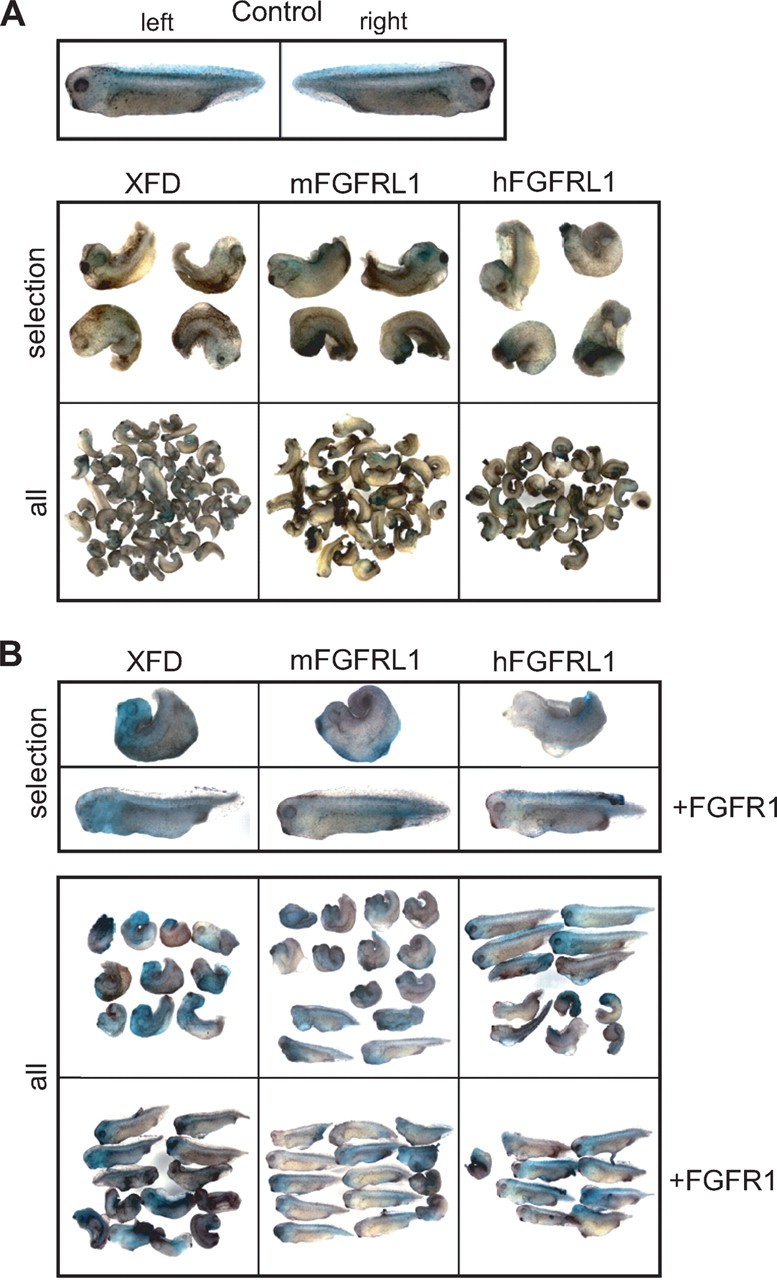 FGFRL1 antagonizes FGF signaling in Xenopus development. Both blastomeres of two-cell stage embryos were coinjected with XFD, mouse FGFRL1 (mFGRL1), or human FGFRL1 (hFGFRL1) mRNA (300 pg/blastomere) and 250 pg of mRNA for the lineage tracer nuclear β-galactosidase. Control embryos injected with lineage tracer only were used to determine stage 35/36 as the end point of development, where all embryos were fixed and processed for β-galactosidase activity. All of the injected embryos are shown beside selected examples presented in close-up views. A, left and right sides of injected control embryos develop normally (top panel). Embryos injected with XFD, mouse FGFRL1, or human FGFRL1 display similar phenotypes (bottom panel). B, coinjection of FGFR1 mRNA together with XFD, mFGFRL1, or hFGFRL1 mRNA rescues the XFD phenotype.