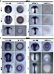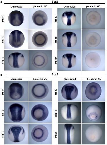 Fig. 1. Ventralized embryos express residual sox2 and sox3. X. laevis embryos were injected in both blastomeres at the two cell stage with β-catenin MO, then raised to the stage indicated, fixed in MEMFA, dehydrated and stained by in situ hybridization for expression of sox2 (A) or sox3 (B). Uninjected control sibling embryos are shown at right for each stage. For β-catenin morphants, a ring of sox2 expression is evident around the blastopore between stages 14 and 16, which fades and has disappeared by stage 19. The same pattern is seen for sox3. Embryos are shown in dorsal views with anterior to the top. |