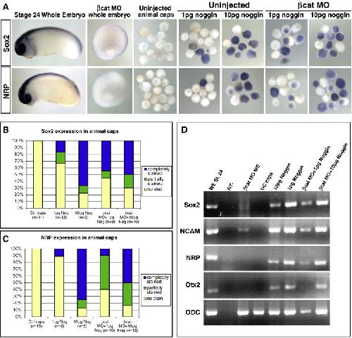 Fig. 8. Ectodermal explants derived from ventralized embryos are neuralized by Noggin. (A) X. laevis embryos were injected in both blastomeres at the two cell stage with β-catenin MO, then re-injected in the animal pole at the 4 cell stage with 1 or 10 pg of noggin mRNA. At stage 9, animal caps were cut, and cultured to stage 24. Animal caps from β-catenin morphants and control embryos injected with noggin mRNA were analyzed by in situ hybridization for expression of sox2 and nrp1. Animal caps cut from β-catenin noggin injected morphants were equally likely to express sox2 and nrp1 as caps cut from embryos injected with noggin mRNA alone. (B, C) Quantification of the results shown in (A). A repeat of the experiment gave similar results. (D) Animal caps cut from β-catenin morphants injected with noggin mRNA also strongly express both sox2 and definitive neural markers as assayed by non-quantitative RT-PCR. |
