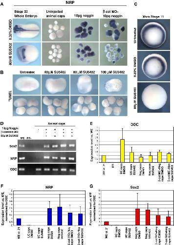 Fig. 9. Ectodermal explants do not require FGF signaling to be neuralized by Noggin. (A) X. laevis embryos were injected in both blastomeres at the two cell stage with β-catenin MO, then re-injected in the animal pole at the 4 cell stage with 1 or 10 pg of noggin mRNA. Embryos were cultured in SU5402 or 0.32% DMSO from the 32 cell stage until stage 8. At stage 8, animal caps were cut, returned to SU5402 or DMSO, and cultured to stage 24. Whole embryos treated with increasing levels of SU5402 from stage 9 to late neurula stages were stained for apoptotic nuclei using TUNEL (B). 93% of embryos treated with 100 μM SU5402 had widespread TUNEL staining (n = 15). Animal caps from β-catenin morphants and control embryos injected with noggin mRNA were analyzed by in situ hybridization for expression of nrp (A), or by RT-PCR for expression of nrp, and sox2 (D). Ornithine decarboxylase (ODC) was used as a loading control. The efficiency of this SU5402 treatment protocol was confirmed by assaying expression of xbra at stage 11 (C). 0% of Su5402 treated embryos expressed xbra (n = 36). Expression of nrp and sox2 was also quantified using quantitative RT-PCR (F, G) and normalized to ODC expression. Animal caps cut from SU5402 treated, noggin-injected embryos still express nrp and sox2 at comparable levels to animal caps from noggin injected embryos treated only with DMSO. This is also true of animal caps cut from noggin-injected, β-catenin-injected, SU5402-treated embryos. |