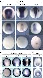 Fig. 4. X. laevis FCN morphants do not express sox2. X. laevis embryos were injected in each blastomere at the 2 cell stage with 20 ng each of follistatin, chordin, and noggin MOS. Embryos were raised to the stage indicated, fixed in MEMFA, and stained for expression of sox2 or epidermal cytokeratin. (A) Some embryos expressed low levels of sox2, but this expression was not seen in a ring. Most FCN morphants do not express sox2. The fraction of embryos falling into each class of sox2 expression are shown in the lower right corner. (B) Cytokeratin is expressed strongly in FCN morphants at all stages assayed, but is excluded from the blastopore and adjacent tissue (22/24 embryos with strong circumferential expression). (C) Xbra expression is expanded in neurula stage FCN morphants. Embryos are shown in dorsal views with anterior to the top. |