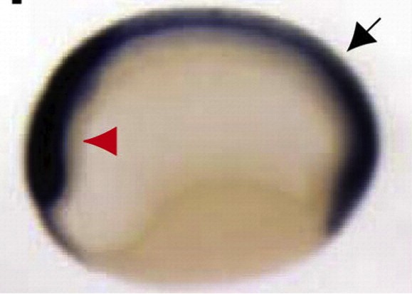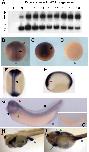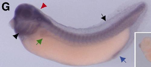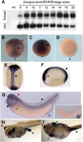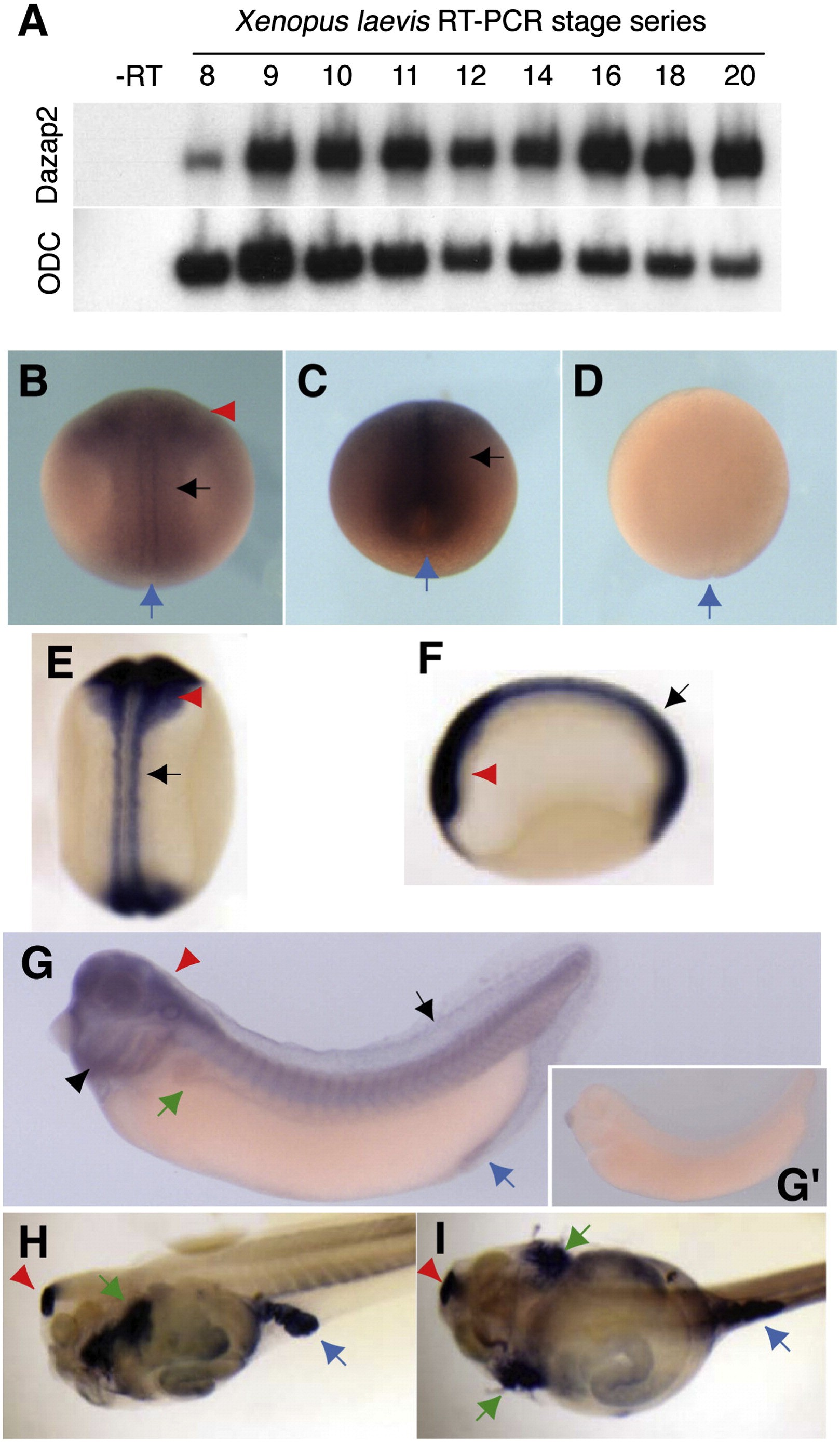 Fig. 1. Temporal and spatial expression of dazap2 mRNA. (A) RT-PCR using dazap2 primers shows that dazap2 is expressed during blastula to neurula stages. (B-I) Dazap2 spatial expression pattern was analyzed by whole-mount ISH, using either antisense (B, C, E-G and H, I) or sense (D and Gâ²) full-length xl-dazap2 probe. Embryos are seen in dorsal view with anterior to top (B and D, E), posterior view with dorsal on top (C), lateral view with head to the left (F, G, Gâ² and H) or ventral view (I). The blue arrow indicates the blastopore. Embryos hybridized with the sense probe in the same ISH conditions show no staining at all stages tested (D and Gâ²). (B) At mid-neurula stage 16 (B) and late neural stage 18 (C, posterior view), dazap2 is present in the head folds (red arrowhead) and throughout the neural plate (black arrow). The staining is enhanced when neurulae are cleared (stage 19, E and F). By stage 32 (G, Gâ²), tailbud embryos express dazap2 in trunk and head region, including the brain (red arrowhead) and spinal cord, the eye, the branchial arches (arrowhead) and the pronephros (green arrow). A faint staining is found in the dorsal fin (arrow) and the proctodeum (blue arrow). Cleared stage 44 tadpoles (H, I) express dazap2 in the brain (red arrowhead), the pronephros (green arrows) and caecum (blue arrow).