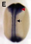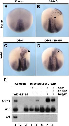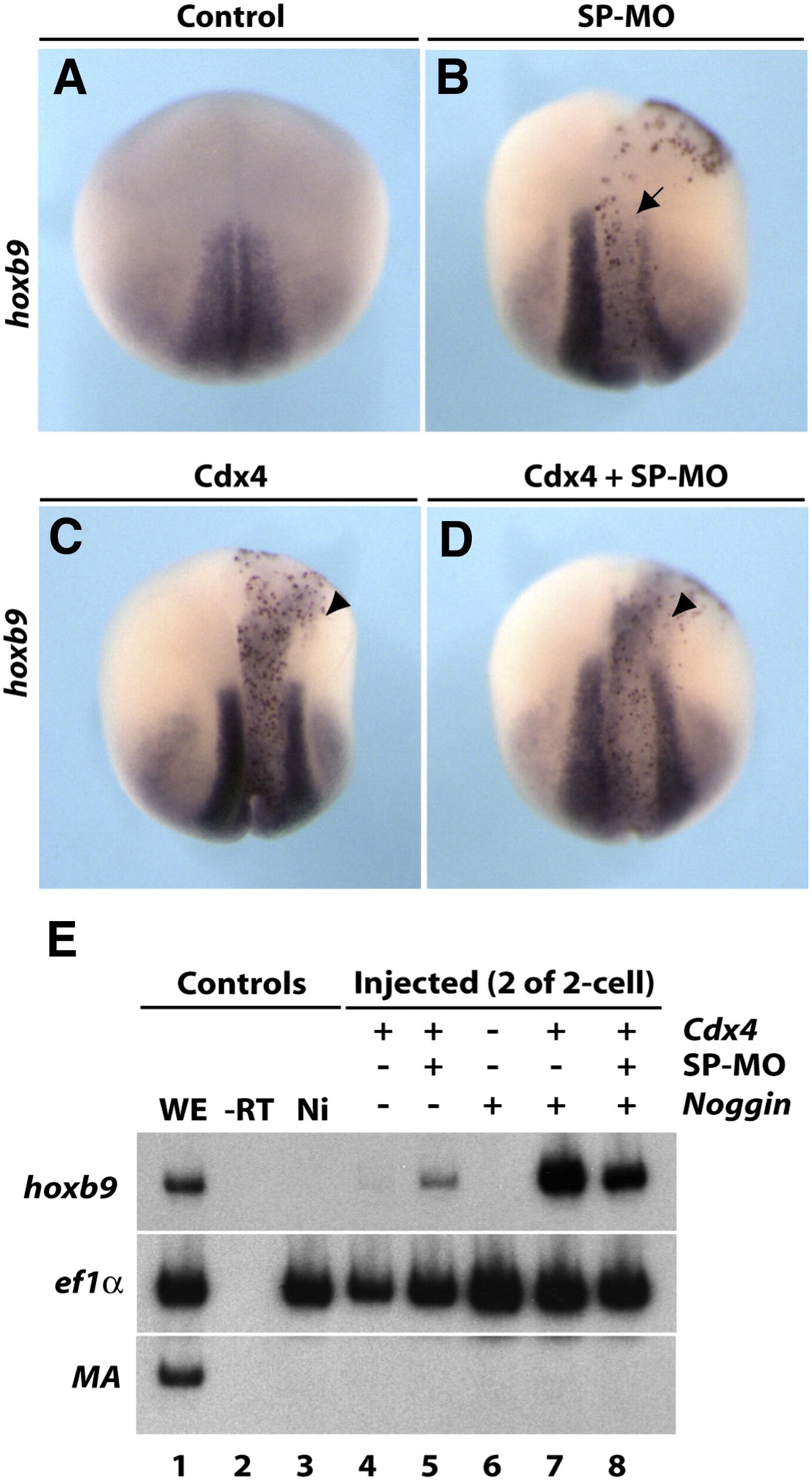 Fig. 4. Cdx4 induction of hoxb9 does not require dazap2. Embryos were injected with either SP-MO (20 ng, B), cdx4 (250 pg, C), or a combination of SP-MO and cdx4 (20 ng and 250 pg, respectively, D) into one cell of 4-cell stages (all were co-injected with lacZ mRNA). Stage 18 embryos are shown in dorsal views, with anterior at the top. As previously stated, SP-MO blocks the endogenous expression of hoxb9 (B, arrow), but has no effect on cdx4-induced ectopic expression of hoxb9 (C and D, arrowheads). (E) Ectodermal explants show that cdx4 induces hoxb9 in Noggin-neuralized caps (lane 7) and this is not affected by the silencing of dazap2 (lane 8). WE: whole embryo, -RT: no reverse transcriptase, Ni: not injected