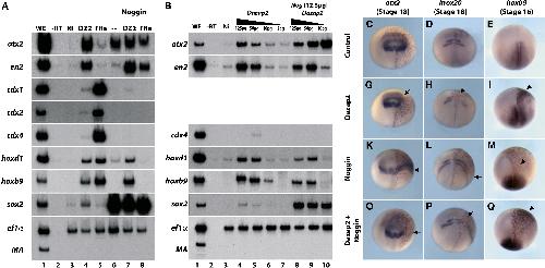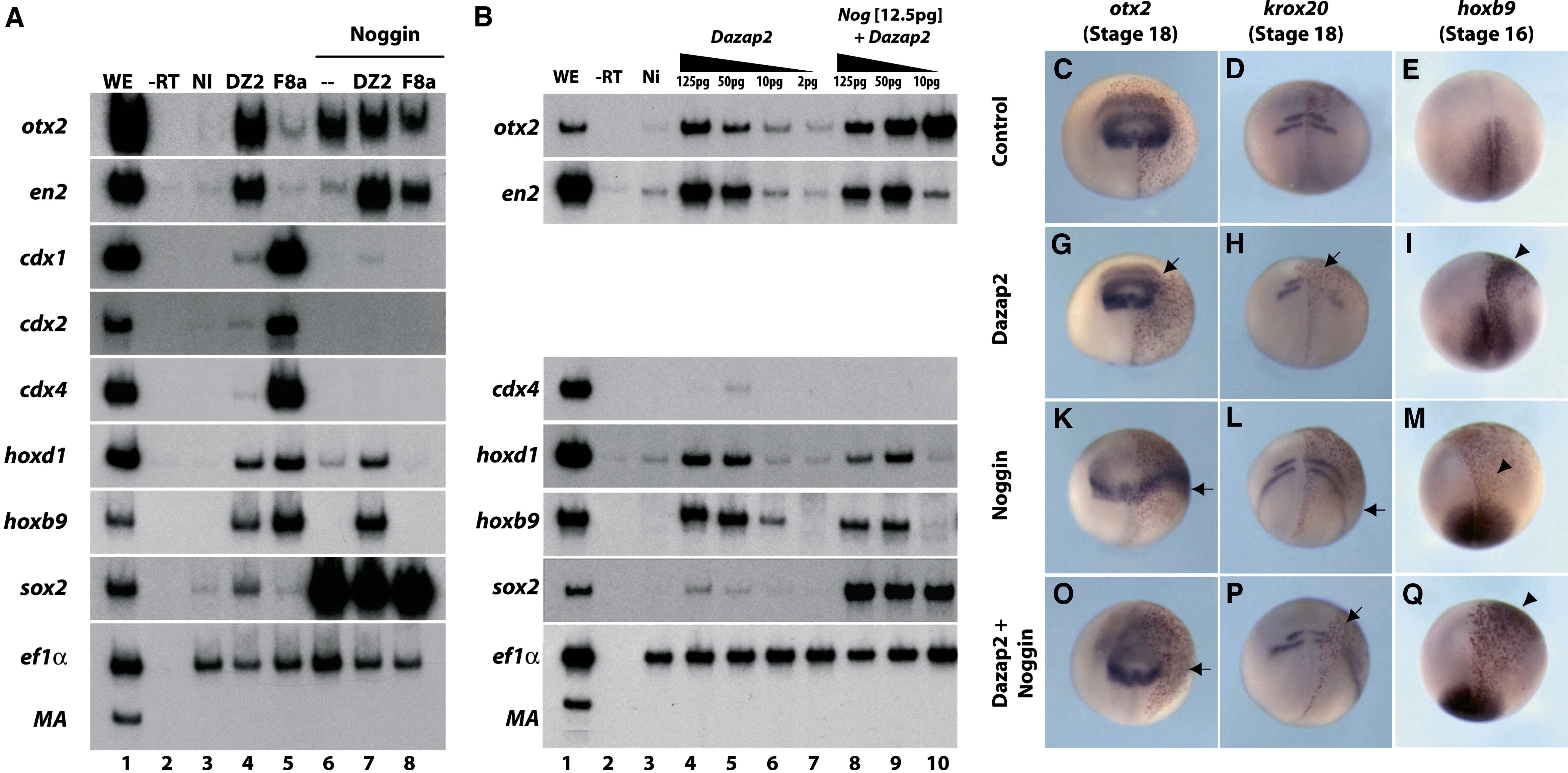 Fig. 6. Dazap2 has potent posteriorizing activities in neuralized tissues. (A) Both cells of 2-cell stage embryos were injected with the following mRNAs: NI, non-injected; dazap2 (DZ2, 250 pg/embryo); fgf8a (F8a, 100 pg/embryo); noggin (12.5 pg/embryo); or combination as indicated above lanes. RT-PCR analysis shows expression of a complete range of anterior and posterior markers in whole embryo (WE, line 1) but none in the NI caps (lane 3). Dazap2 and fgf8a both induce posterior genes hoxd1 and hoxb9, but Dazap2 also activates otx2 and en2 while fgf8 activates cdx1, 2 and 4 (lanes 4, 5). Upon neuralization by noggin (indicated by sox2 expression), animal caps express anterior markers only (otx2, lane 6). Dazap2 and noggin co-injections (lane 7) induce a complete range of anterior and posterior markers (but not cdx1, 2 or 4), while Fgf8 and Noggin co-injections only partially posteriorize the explants (en2 induction, lane 8). (B) A range of dazap2 mRNA (125 pg/cell, 50 pg/cell, 10 pg/cell or 2 pg/cell) alone or in combination with noggin (12.5 pg/cell) was injected into both cells of 2-cell stage embryos. Explants were dissected at stage 9 from these embryos and aged until stage 18. Decreasing levels of dazap2, alone or in combination, show a decrease level of induction of en2, hoxd1 or hoxb9. This is the opposite effect for otx2, which shows a decrease of induction alone but an increase induction in combination with noggin. Additionally, sox2 induction requires noggin. For in vivo analysis, embryos were injected at 4-cell stage with lacZ (100 pg/cell, C�E), dazap2 (250 pg) and lacZ (G�I), noggin (25 pg) and lacZ (K�M) or a combination of dazap2, noggin and lacZ (O�Q). Dazap2 injected embryos show a reduction of otx2 and krox20 expression (arrow) and ectopic expression of hoxb9 (arrowhead) in the anterior neural plate at stages 16�18 (G�I). Noggin-injected embryos show an increase in both otx2 and krox20 (arrow), and a decrease in hoxb9 expression (arrowhead) (K�M). The combination of dazap2 and noggin results in rescued otx2 and krox20 expression in injected cells (arrows) and hoxb9 expression is activated ectopically in the anterior neural plate (arrowhead) (O�Q).