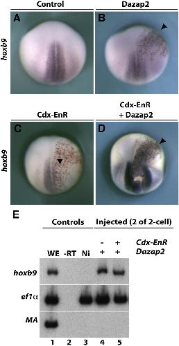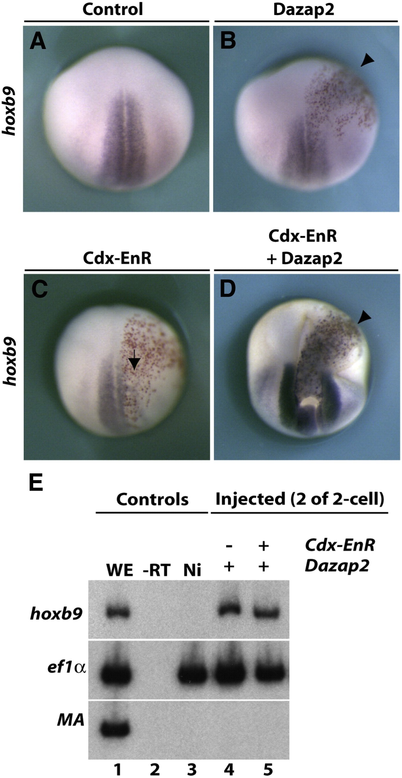 Fig. 8. Dazap2 activity is Cdx4-independent. mRNAs for dazap2 (250 pg, B), cdx-EnR (250 pg, C) or a combination of dazap2 and cdx-EnR (250 pg each, D) were injected into one cell of 4-cell stage embryos (all were co-injected with lacZ mRNA). Stage 18 embryos are shown in dorsal views, with anterior at the top. Dazap2 injections induce ectopic hoxb9 expression (B, arrowhead) while cdx4-EnR overexpression blocks hoxb9 induction (C, arrow). Combined Dazap2 and cdx-EnR injection results in robust hoxb9 induction (D, arrowhead). Parallel experiments in explants (E) show that Dazap2 induces hoxb9 either alone (lane 4) or in the presence of Cdx-EnR (lane 5).