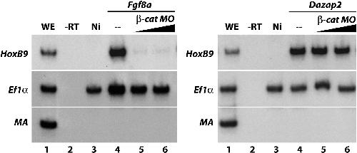 Fig. 9. Dazap2 activity does not depend on canonical WNT signaling. (A) RT-PCR was performed using whole embryos injected with fgf8a (100 pg/cell) either alone or in combination with β-catenin MO (either 40 ng/cell or 60 ng/cell) into two cells at the 2-cell stage, animal caps were dissected and then aged until stage 19 (WE, whole embryo sibling controls; -RT, no reverse transcriptase control; Ni, non-injected explant control). Hoxb9 expression is lost at both concentrations of β-catenin MO (lanes 5 and 6) when compared to Fgf8a alone (lane 4). (B) When the experiment is repeated using Dazap2 (125 pg/cell), β-catenin MO is unable to block Dazap2 induction of HoxB9 expression (compare lane 4, with co-injection lanes 5 and 6)