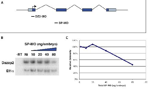 Supplemental Figure 1. Dazap2 is conserved in the deuterostome clade. (A) Dazap2 encodes a 168 amino acid protein that contains several conserved SH2 (YxxÏ, indicated by light grey boxes) and SH3 (PxxP, indicated by dark blue boxes) consensus target sequences, as well as a polyproline rich region (red box). (B) The alignment of fourteen Dazap2 proteins found throughout the deuterostome clade shows a high conservation (Metazome.net). The conserved domains are highlighted in red, with the annotation based on the Xenopus laevis protein sequence. (Hsa, Homo sapiens; Cfa, Canis familiaris; Rno, Rattus norvegicus; Mmu, Mus musculus; Xtr, Xenopus tropicalis; Xla, Xenopus laevis; Dre, Danio rerio; Gac, Gasterosteus aculeatus; Tru, Takifugu rubripes; Ola, Oryzias latipes; Csa, Ciona savignyi; Cin, Ciona intestinalis; Bfl, Branchiostoma floridae; Spu, Strongylocentrotus purpuratus.) (C) A phylogenic tree was generated to demonstrate the relative distances of proteins using a UPGMA best tree method (MacVector).
