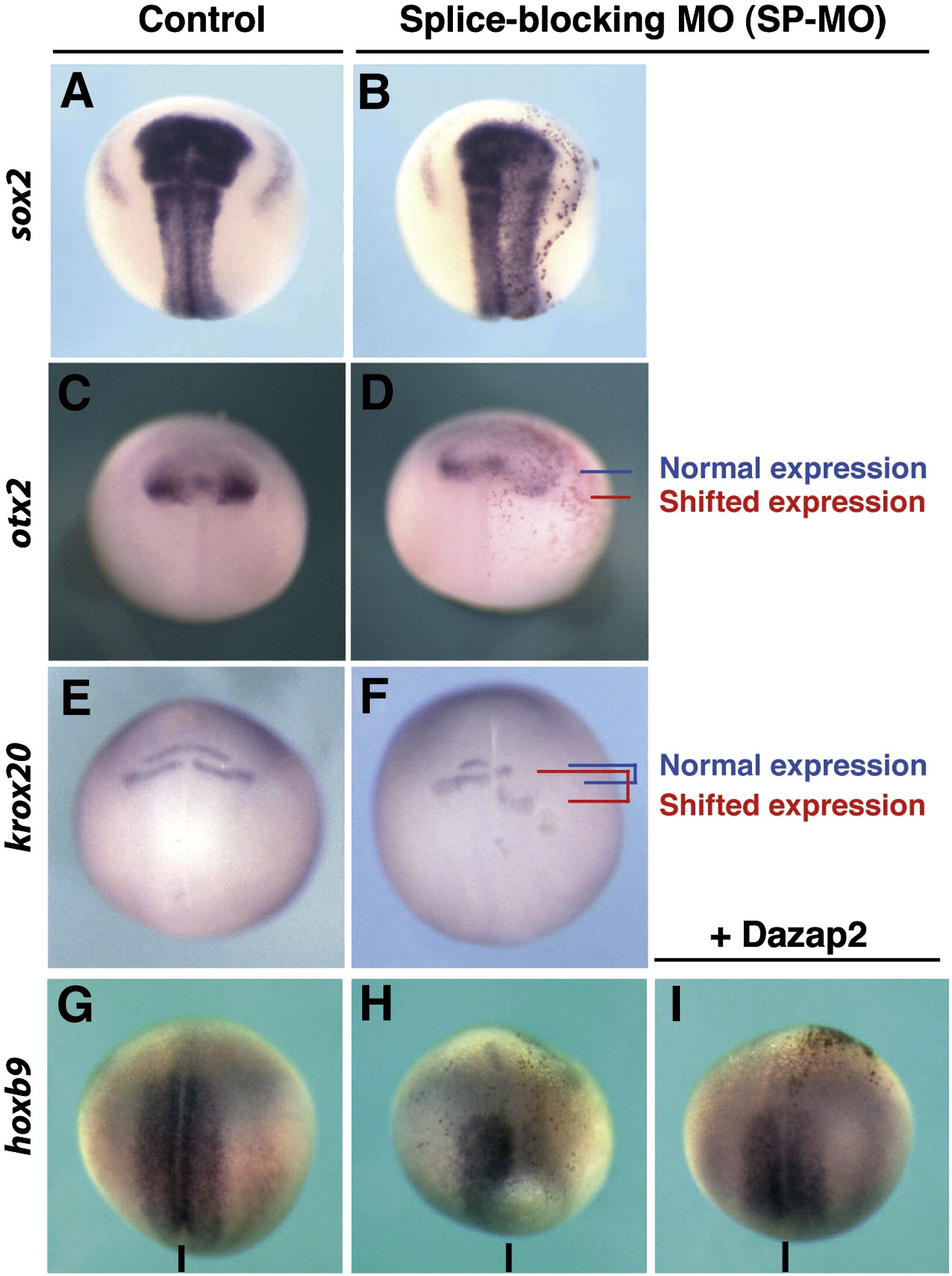 Fig. 2. Dazap2 silencing results in a loss of hoxb9 with concomitant posterior shift of anterior neural markers. Embryos co-injected with Dazap2 SP-MO and lacZ mRNA were analyzed at stage 18 (shown in dorsal views, with anterior at the top). (A, B) Sox2 expression domain was only marginally affected. (C, D) Otx2 domain was expanded and shifted posteriorly within the neural plate (blue and red lines indicate normal and shifted posterior limits respectively). (E, F) Krox20 expression (rhombomeres 3 and 5) also shows a posterior shift in SP-MO injected embryos (blue and red lines indicate normal and posteriorized rhombomeres 3 and 5 respectively). Expression of hoxb9 is decreased/lost in injected cells (G, H) and can be rescued when dazap2 mRNA (250 pg) is co-injected with SP-MO (I). The line indicates the sagittal midline