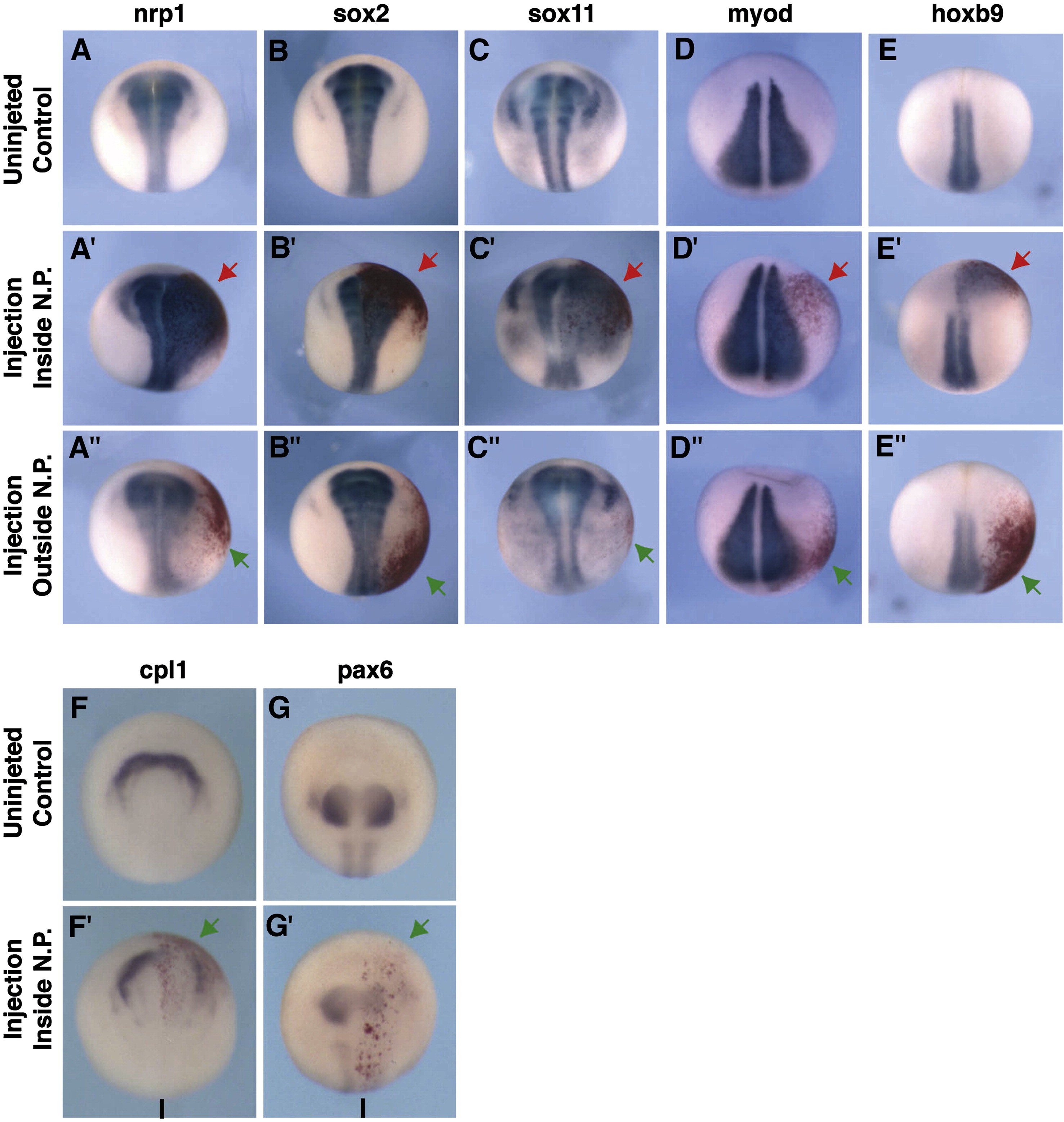 Fig. 5. Dazap2 gain-of-function expands the neural plate and induces a posterior identity at the expense of anterior fates. Injections of dazap2 mRNA were targeted either dorsally (Aâ²-Hâ², red arrow) or ventrally (Aâ²-Eâ², green arrow). Embryos were analyzed at stages 16-18 (shown in dorsal views with anterior at the top (A-Eâ²), or frontal views (F-Hâ²)). The injected side is on the right, injected cells are marked by the red nuclear stain. General neural markers nrp1 (A-Aâ²), sox2 (B-Bâ²) and sox11 (C-Câ²) are expanded when Dazap2 is expressed in or around the neural plate but not when dazap2 is injected on the ventral side of the embryo. MyoD (D-Dâ²) expression is not affected by either dorsal or ventral injections. Hoxb9 (E-Eâ²) is strongly ectopically expressed in dorsal but not ventral targeted injections. The expression of anterior neural markers cpl1 (F, Fâ²) and pax6 (G, Gâ²) is decreased when dazap2 is targeted to the anterior neural plate (arrows, bar indicates the midline).