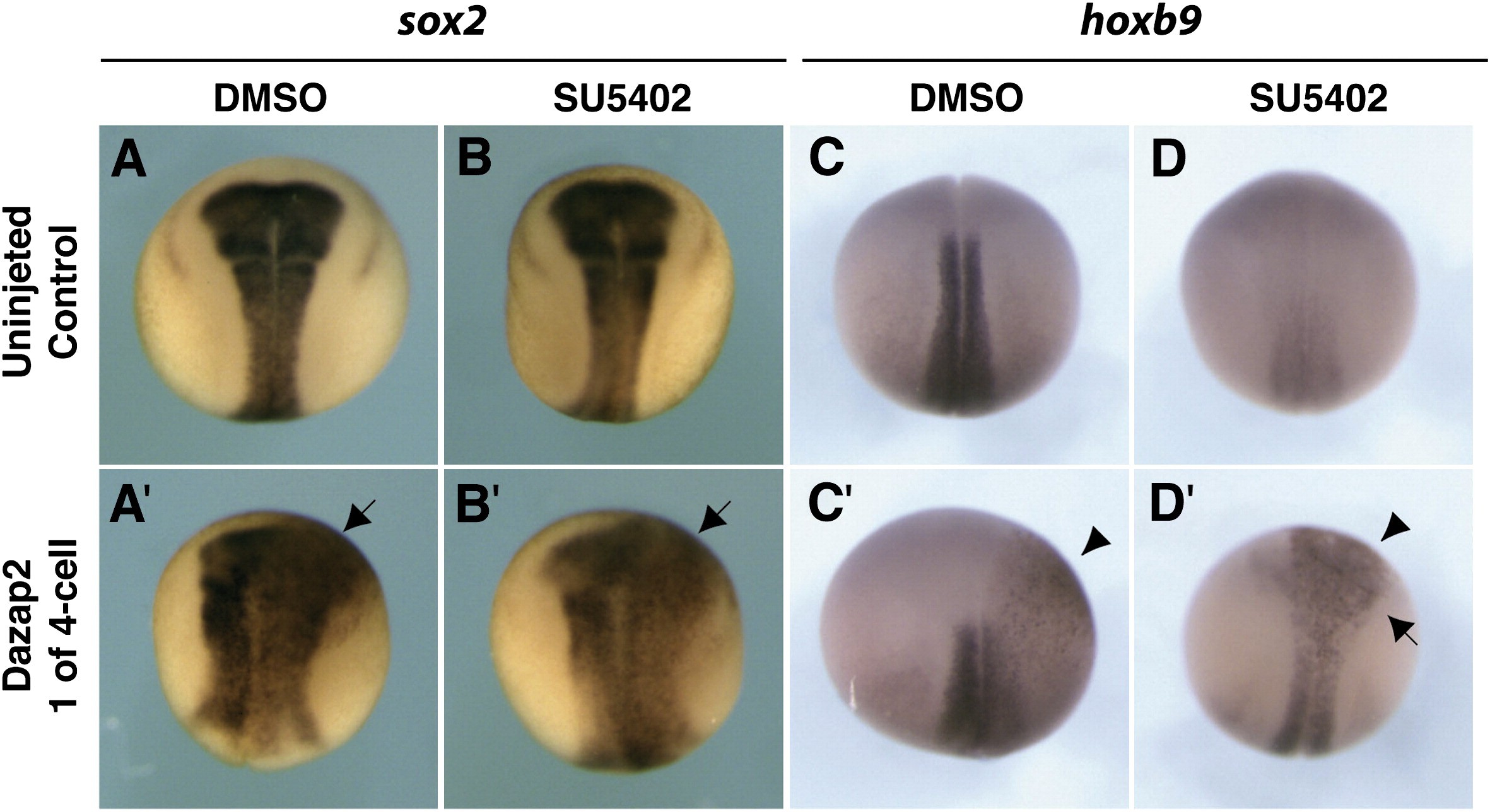 Fig. 7. Loss of FGF receptor signaling in the neural plate is rescued by dazap2. Uninjected control embryos (A-D) or embryos injected with dazap2 mRNA (250 pg, one cell at 4-cell stage) (co-injected with lacZ mRNA, Aâ²-Dâ²) were treated with either DMSO (1%, carrier control) or SU5402 (80 μM) at stage 12. Stage 18 embryos are shown in dorsal views, with anterior at the top. Uninjected embryos show no change in sox2 expression after SU5402 treatment (B), in contrast, hoxb9 expression was strongly reduced (D) in treated embryos, when compared to sibling controls (A and C, respectively). Dazap2 mRNA injected embryos show both an expansion (arrow) of sox2 expression (Aâ² and Bâ²) and ectopic (arrowhead) expression hoxb9 (Câ² and Dâ²) when treated with either DMSO or SU5402.