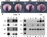 Fig. 3. FGF8a posteriorizing activity requires Dazap2. Embryos were co-injected with lacZ mRNA and either dazap2 SP-MO (20 ng, B), fgf8a (10 pg, C) or a combination of SP-MO and fgf8a (20 ng and 10 pg, respectively, D) into one cell at the 4-cell stage. Stage 18 embryos are shown in dorsal views, with anterior to the top (the line indicates the sagittal plane). Compared to control embryos (A), the SP-MO blocks hoxb9 expression on the injected side (B, arrow) while Fgf8a induces ectopic hoxb9 expression (C, arrowhead). When fgf8a and SP-MO are combined, hoxb9 expression is blocked and no ectopic expression is observed (D, arrow). (E) RT-PCR was performed on whole embryos injected with SP-MO (either 40 ng/cell or 20 ng/cell) into two cells at the 2-cell stage, then aged until stage 20 (Ctl, control sibling controls; -RT, no reverse transcriptase control). Hoxb9 expression is strongly decreased (lanes 3, 4), especially at the highest concentration of SP-MO, while cdx4 and sox2 expression remain unaffected. (F) Animal caps were dissected at stage 9 from embryos injected with either dazap2 mRNA (250 pg/embryo, lane 4), SP-MO (40 ng/embryo, lane 5), fgf8a (200 pg/embryo, lane 6), a combination of SP-MO and fgf8a (40 ng/embryo + 200 pg/embryo, lane 7) or a combination of fgf8a, SP-MO and dazap2 mRNA (40 ng + 200 pg + 250 pg/embryo, lane 8) at the 2-cell stage (Ni: non-injected caps). At stage 18, hoxb9 is induced by fgf8a (lane 6) but this induction is blocked in the presence of SP-MO (lane 7). This loss is rescued by addition of dazap2 mRNA (lane 8). In all combinations with Fgf8a, cdx4 is robustly induced.