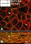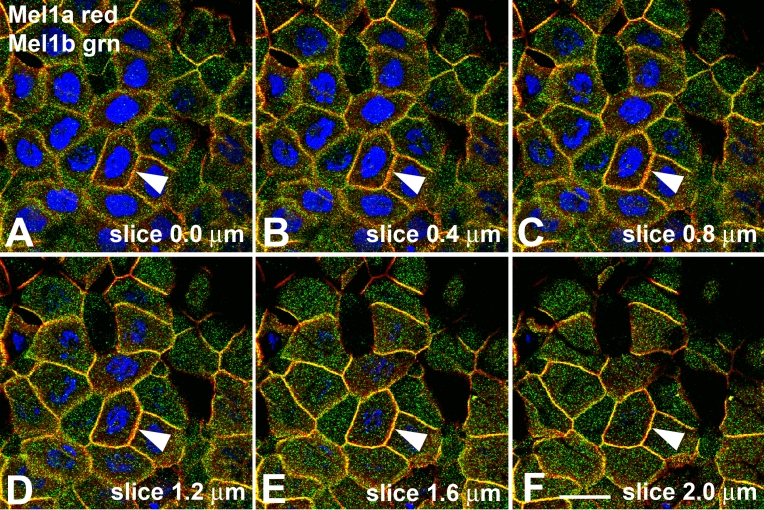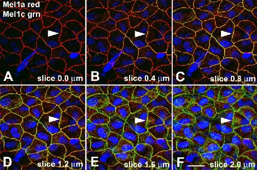 Figure 6. Localization of Mel1a and Mel1b in progressive confocal optical slices of Xenopus corneal epithelium. A: Image of the most superficial surface of the surface corneal epithelium. Note the predominance of yellow (merged red and green) labeling of most lateral membranes, with a lesser amount of interdigitated red Mel1a labeling (note arrowheads indicating an example of this). B-F: As the 0.4-µm slices progress deeper into the corneal epithelium layer , there is not a transition from red to green labeling as was seen with Mel1a-Mel1c, but instead the predominance of yellow labeling with some interspersed red labeling is maintained throughout all slices. Nuclei are stained with DAPI. The magnification bar (F) represents 20 µm.