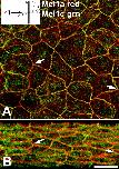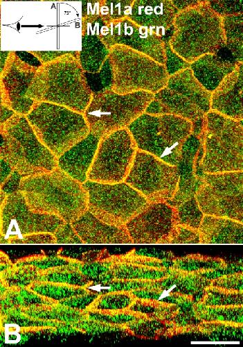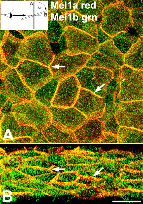 Figure 7. Confocal double-label immunocytochemical localization of Mel1a and ZO-1 in Xenopus corneal whole mounts. A: Mel1a and ZO-1 immunolabeling is observed on the lateral plasma membrane, with some immunoreactivity also occurring in the cytoplasm. Mel1a (red) labeling is present predominantly as very broad bands on the lateral membranes, including the obliquely-oriented lateral membranes (arrows). The plasma membrane has an abundance of yellow labeling, indicative of a very close proximity of red Mel1a and green ZO-1. The ZO-1 labeling was not as broadly distributed on the lateral membrane. The inset illustrates the 72° rotation on the x-axis of the image in A, indicating the orientation relative to the viewer’s eye in B. B: Three-dimensional reconstructions of confocal z-stacks of optical slices were rotated at 72° degrees on the x-axis to enable optimal viewing of the pattern of immunolabeling. Arrows are provided as reference points to indicate the same points on panel A. The rotated image shows that the green ZO-1 labeling is generally located apically to the red Mel1a labeling. The ZO-1 labeling appears as a relatively narrow continuous band of green labeling on the lateral plasma membrane, whereas a much broader band of red Mel1a labeling appears directly basal to the ZO-1 label. Significant yellow labeling is observed, indicating that the Mel1a receptor is in very close proximity to ZO-1. The confocal images in both panels are comprised of seven optical slices of 400 nm each in the z-series. The magnification bar (B) represents 20 µm.