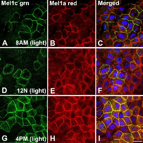 RESULTS: All three melatonin receptor subtypes were expressed on the surface and sub-superficial layer of CE cells, but with different sub-cellular distributions. The Mel1a receptor was highly localized to the lateral plasma membrane of the surface CE, but also displayed cytoplasmic localization at some times of day, especially at night. Mel1c showed a similar pattern of labeling to Mel1a, but there were some distinctive differences, insofar as the Mel1c receptors were usually located immediately basal to the Mel1a receptors. The relative degree of membrane and cytoplasmic labeling of the Mel1c receptor also oscillated during the 24-h period, but was out of phase with the changes that occurred in the Mel1a receptor localization. Furthermore, in the late afternoon time point, the Mel1a and Mel1c receptors were highly co-localized, suggestive of heterodimerization, whereas at other time points, the two receptors were distinctly not co-localized. Double-label immunocytochemistry of Mel1a and ZO-1 demonstrated that the Mel1a receptor was located basal to the tight junctions, on the lateral membrane in very close proximity to the ZO-1 protein.